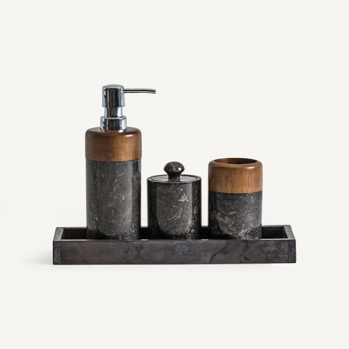Дозатор для мыла NEPTUNO изготовлен из двух материалов - камня оникса и эбенового дерева. Уникальный тон и фактура изделий станет выражением вашей индивидуальности в ванной комнате.