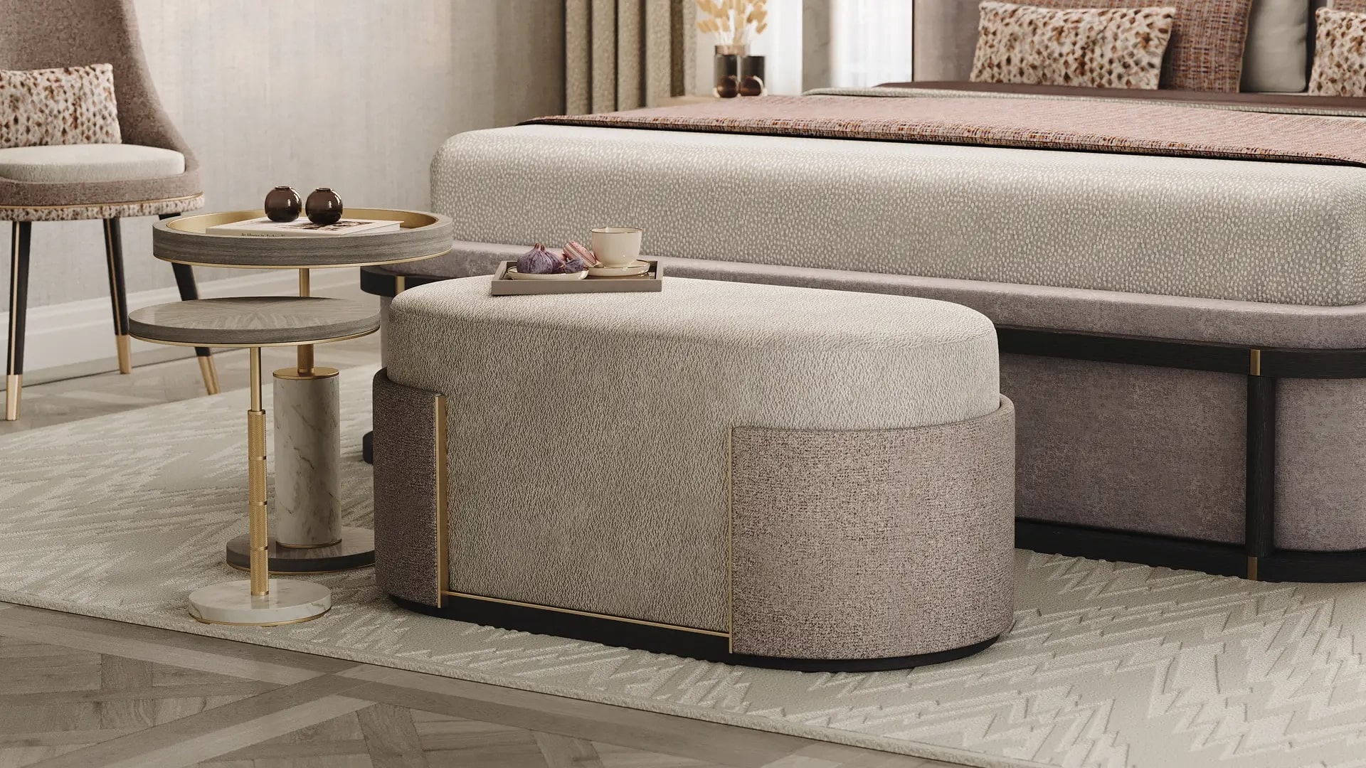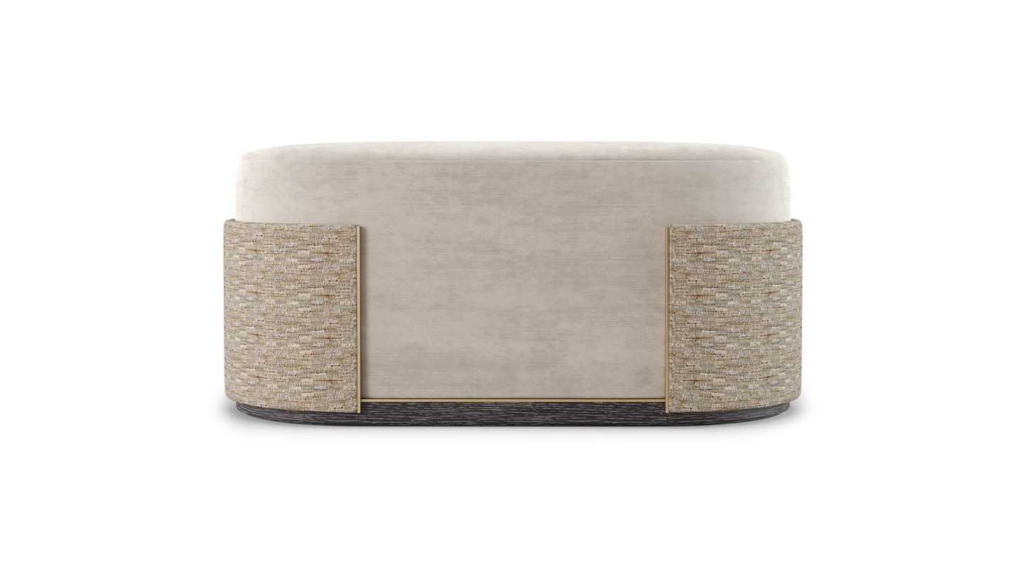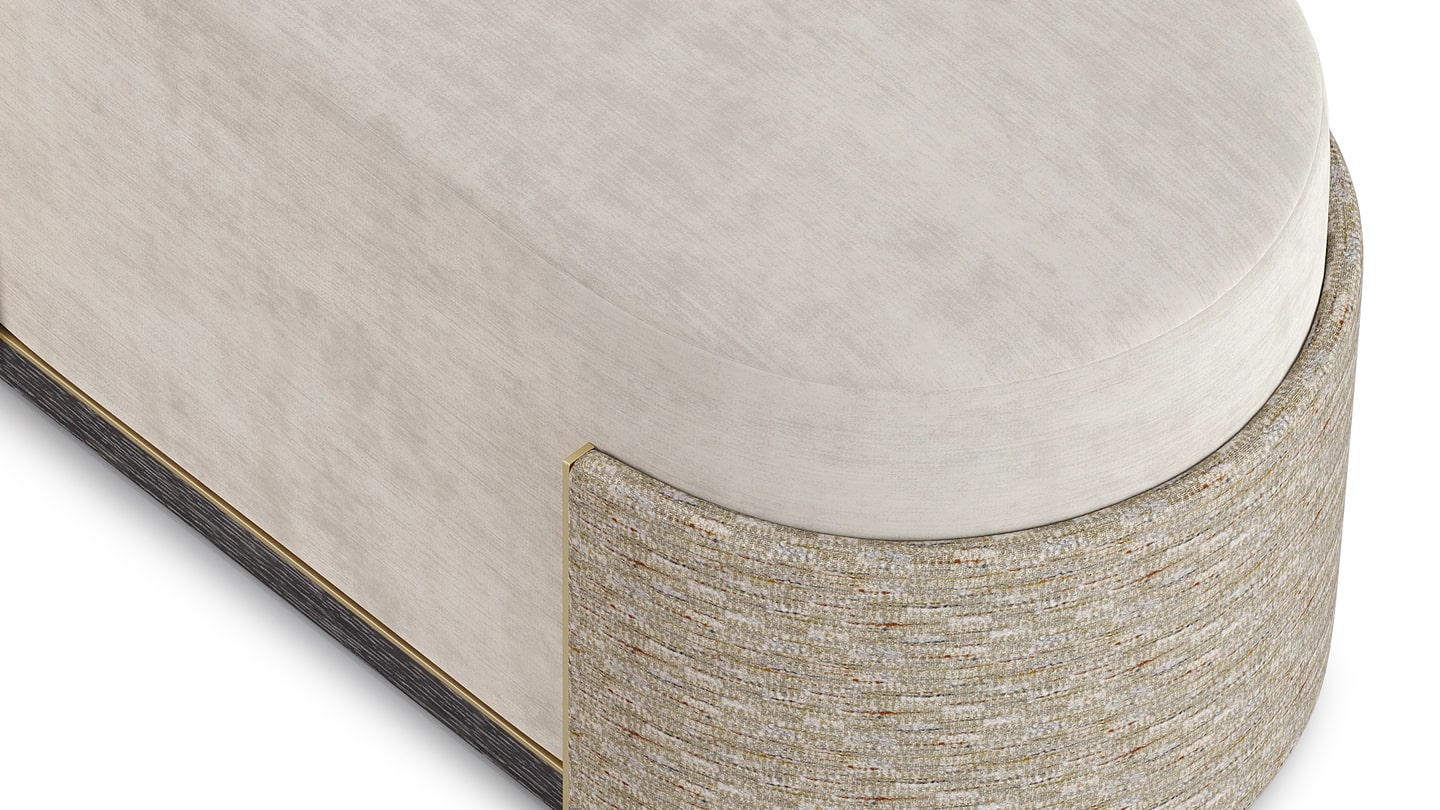 "Являясь эволюцией круглого стула BURGOS, скамья BURGOS в форме ромба имеет обитое бархатом сиденье, украшенное обтянутой тканью “манжетой”, окантованной матовой латунью".