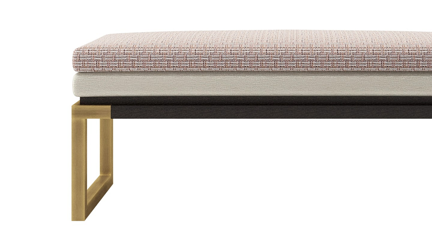 "Эффектное угловое основание, изготовленное из патинированного металла и деревянного шпона, придает скамье GARDNER сильное ощущение присутствия, в то время как плавающее мягкое сиденье, обитое контрастными тканями, придает легкость прикосновениям".