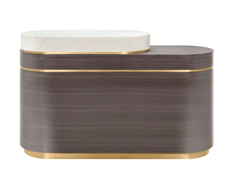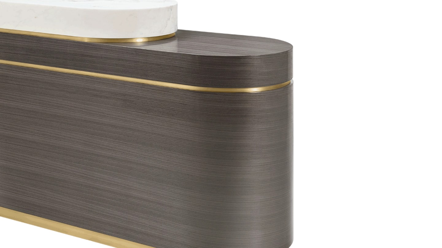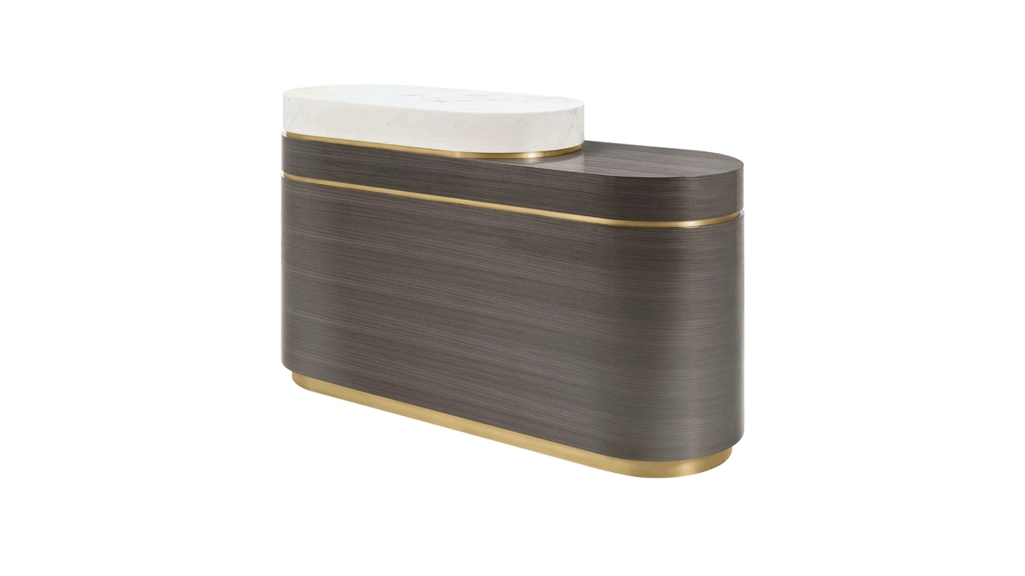 Безупречная стойка LISBON, выполненная из гладкого сочетания глянцевого деревянного шпона, нетронутого камня и матовой латуни, является чрезвычайно универсальным предметом мебели, который может служить баром дома или стойкой администратора в коммерческом помещении.