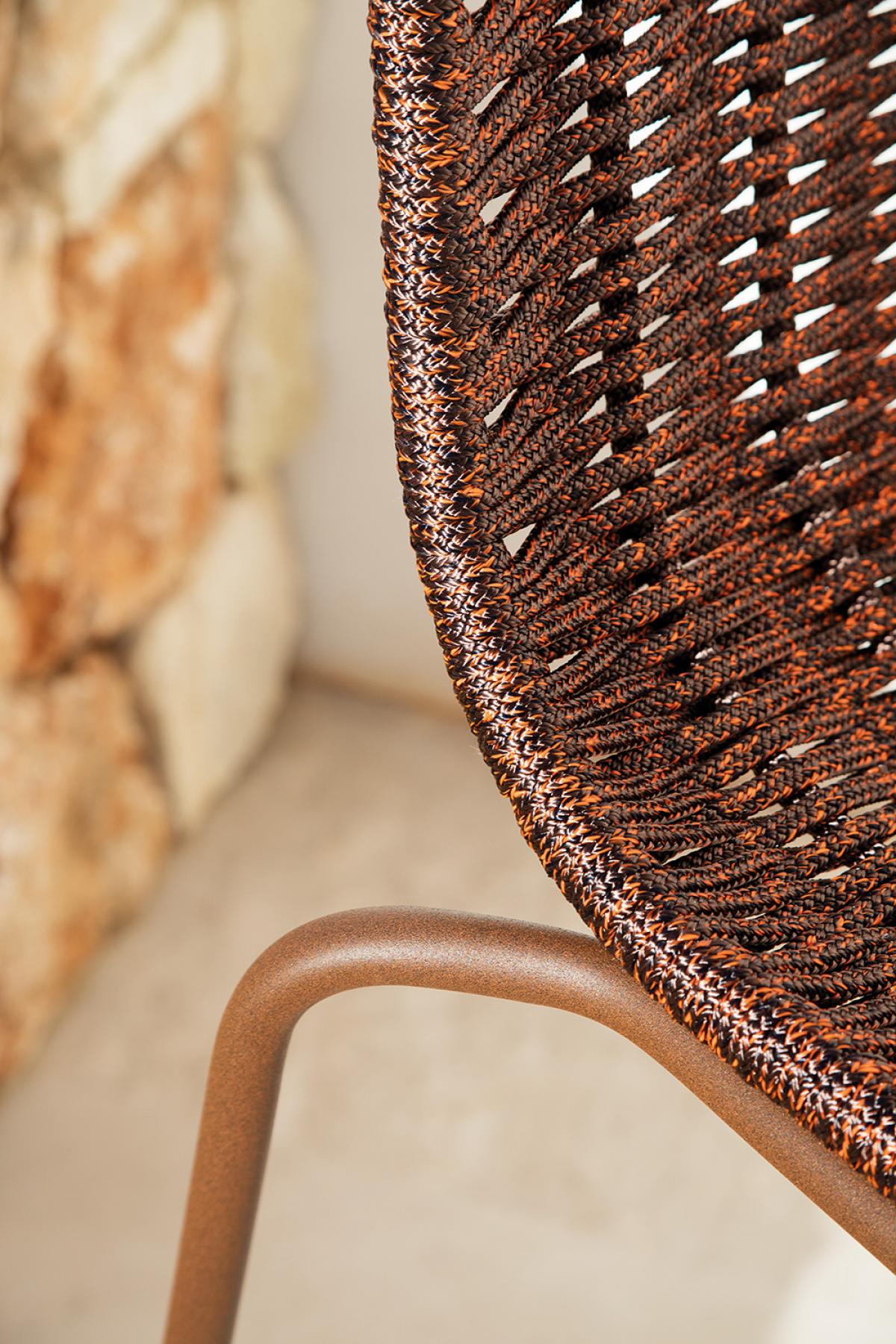 Барный стул из трубы из нержавеющей стали. Сиденье и спинка ручной работы с высокопрочной веревкой толщиной 7 мм/0,27 дюйма. Ножки из лакированной трубы из нержавеющей стали. Штабелируемый.
