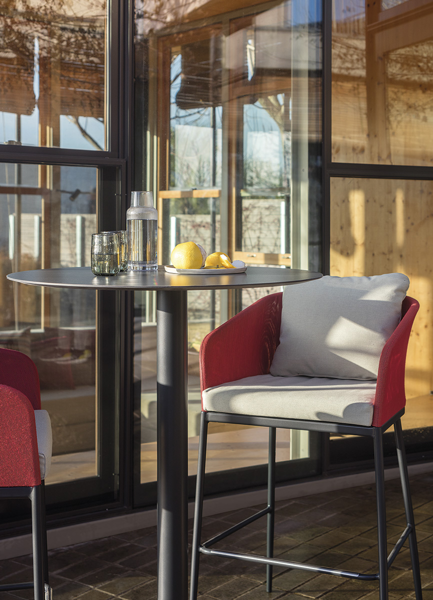 Барный стул изготовлен из высокопрочной алюминиевой трубки. Возможность настройки с помощью широкого спектра технических тканей, полностью подходящих для наружного использования.