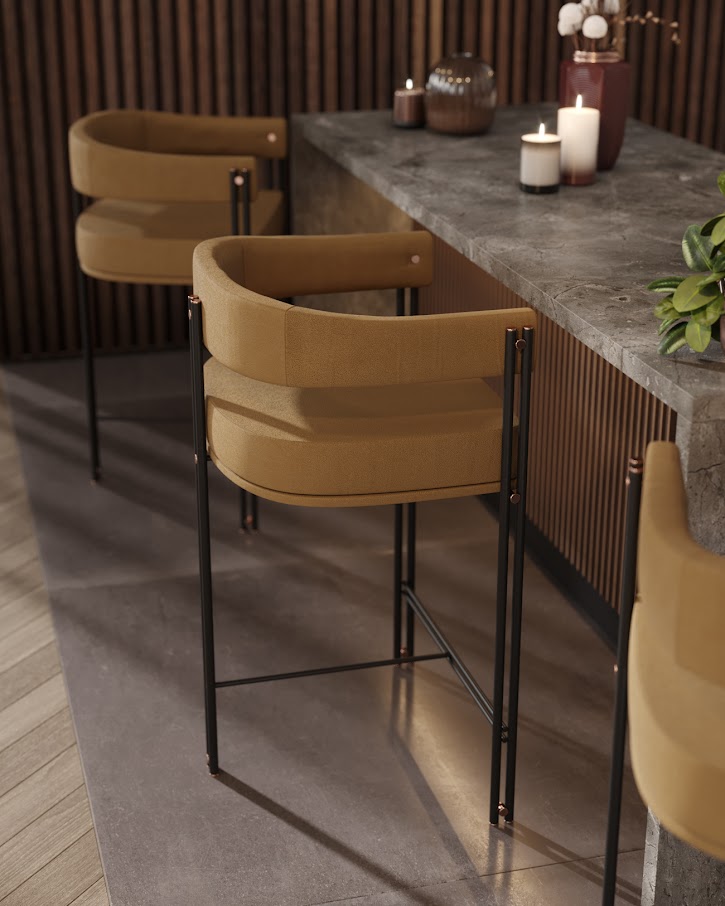 Бамбук, как известно, одно из самых крепких и элегантных деревьев в природе. Поэтому пары металлических трубчатых ножек, соединенных металлическими деталями, которые удерживают структуру обивки, вдохновили нас на создание барного стула Bamboo, придающего любому разделению комнаты стильный штрих и характер.