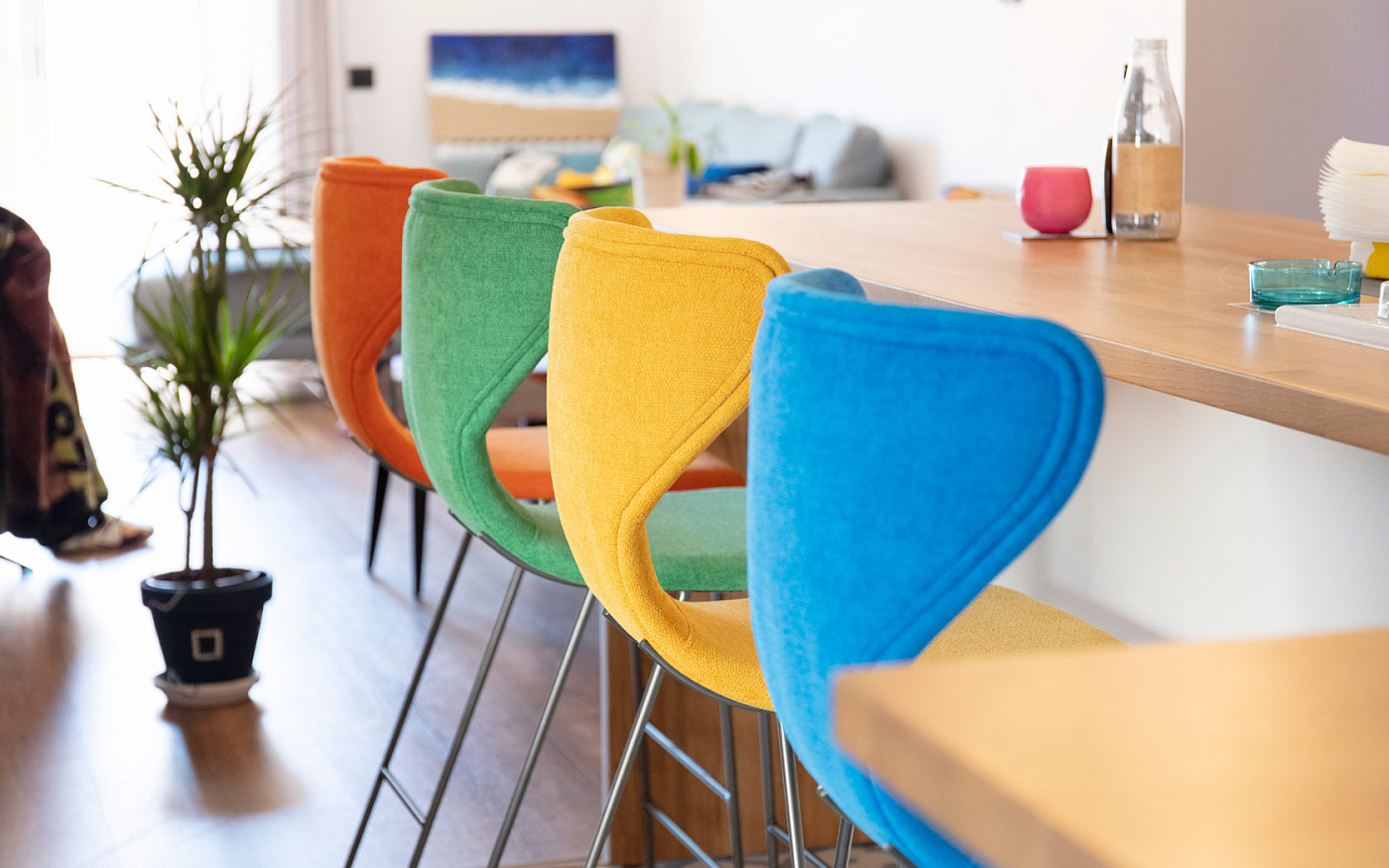 Мы представляем новый тип мебели, который наши клиенты постоянно требовали в течение последних нескольких лет: высокие стулья для кухонных баров, которые в настоящее время устанавливаются во многих домах с кухней открытого плана. Имея это в виду, мы создали Helga с деревянными ножками, а также Marlon, Denzel и Burt с металлическими ножками, все они доступны с 3-мя высотами сидений, 45 см (версия для кресла), 65 и 75 см (версия для табуретки). Они выделяются благодаря своему эргономичному дизайну и великолепному комфорту. Модели Denzel, Marlon и Burt в версии для стула (высота сиденья 45 см) могут использоваться в качестве самостоятельных декоративных элементов благодаря их металлическим ножкам без использования в качестве стульев для столовой.
