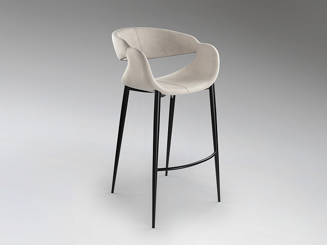 Высокий табурет. Металлические ножки с матово-черной отделкой и подставка для ног. Сиденье и спинка из фанеры и поролона. Обивка из 100% полиэстера в цвете светлого камня с декоративной строчкой. Химчистка.