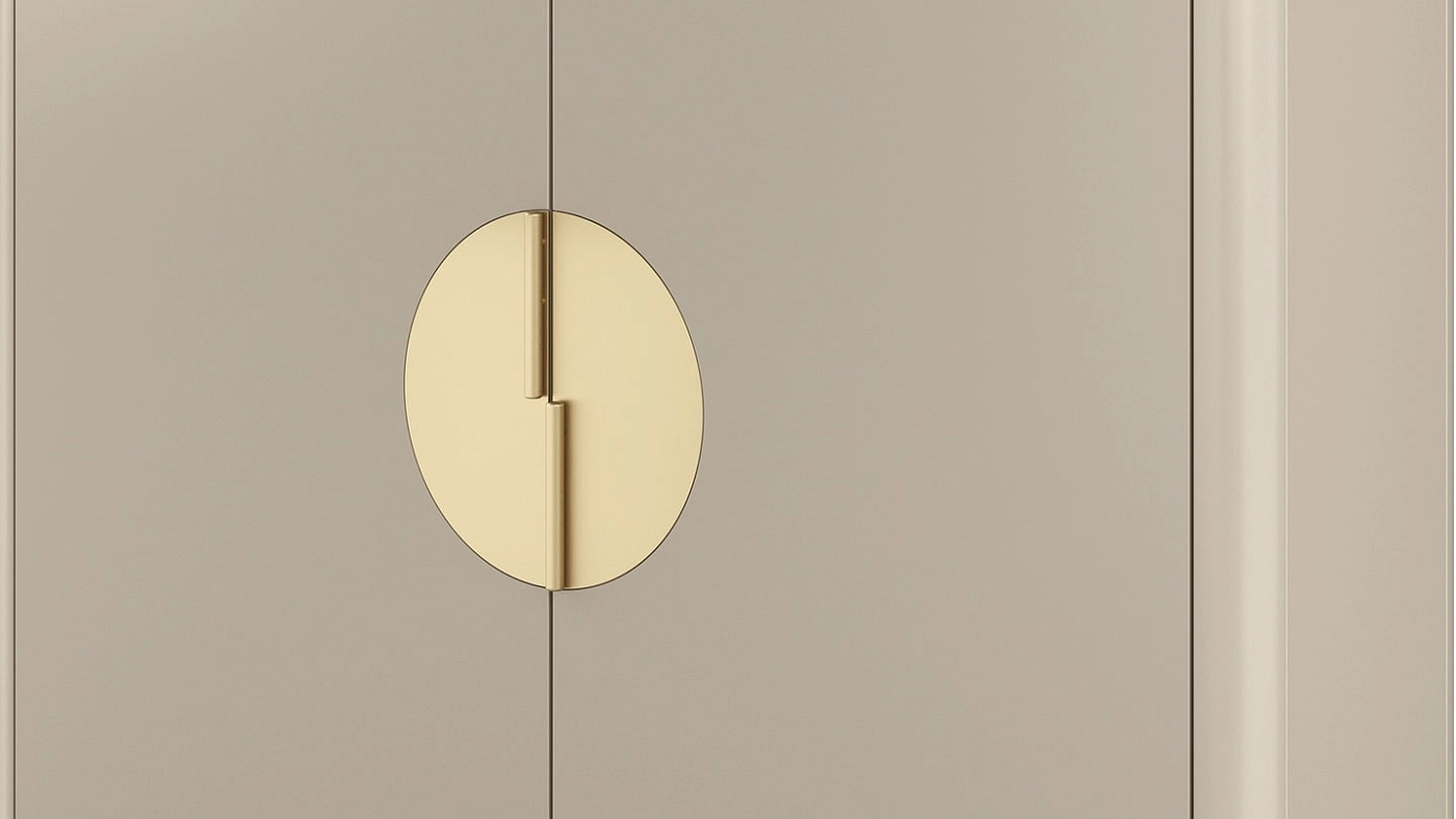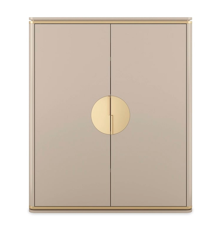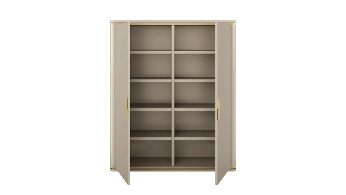 Шикарный шкаф BILBAO изготовлен из глянцевого лакированного дерева и минимально украшен деталями из матовой латуни, которые видны на ручках, а также на вставных швах сверху и снизу. Две его дверцы открываются, открывая четыре практичные полки.