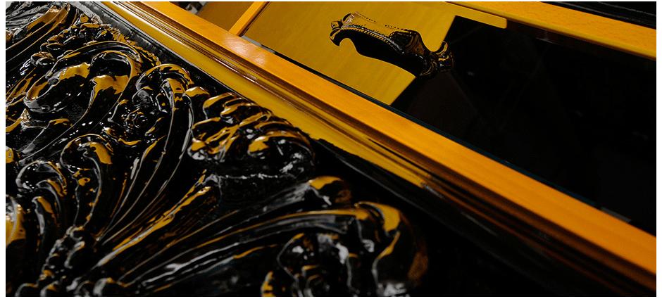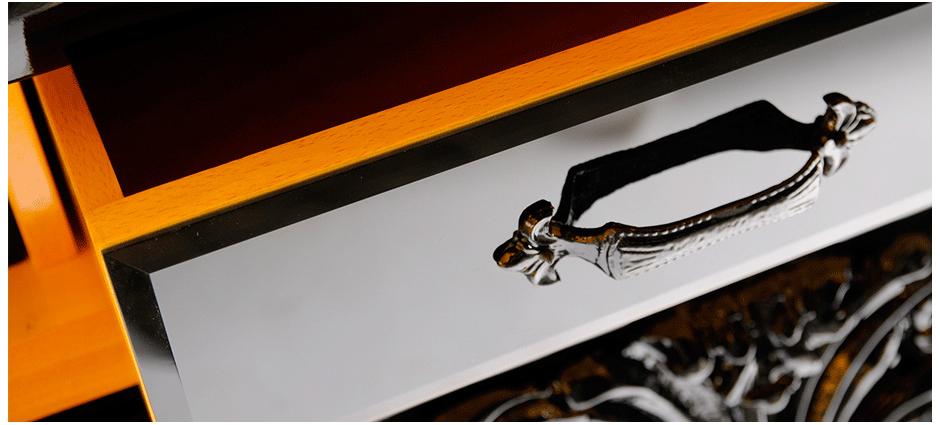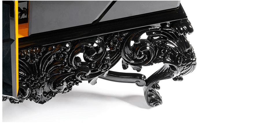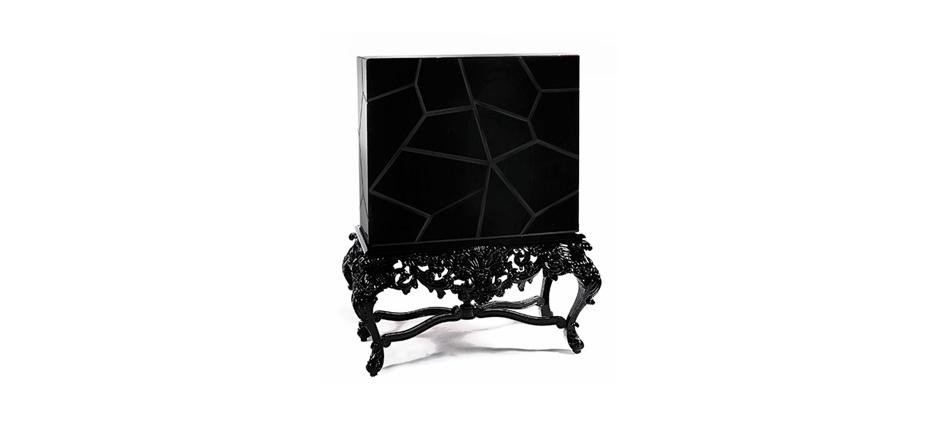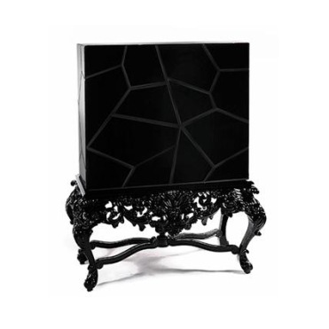 Шкаф Victoria ломает стереотипы и нарушает традиционные условности. Этот роскошный предмет мебели отделан фрагментами черного стекла, резкие контуры которых создают иллюзию, будто он собран из отдельных кусков. Основание шкафа изготовлено из красного дерева в лучших традициях стиля барокко. Двери шкафа открываются после прикосновения, давая возможность увидеть его роскошный интерьер, покрытый полупрозрачным лаком с желтым оттенком. Шкаф оборудован пятью выдвижными ящиками, отделанными из натуральной кожей, и полкой из дымчатого стекла.