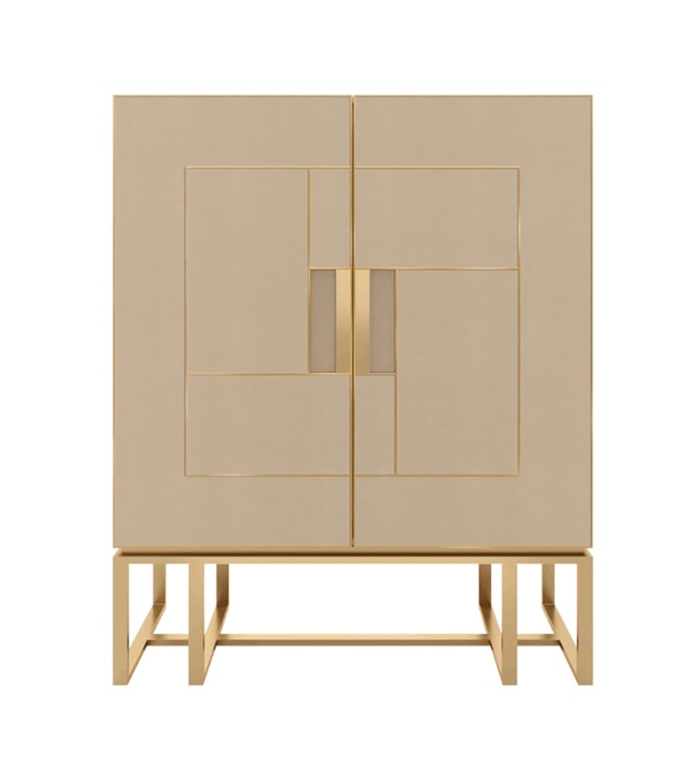 Угловатый силуэт шкафа PIEMONTE подчеркивается деталями из матовой латуни, которые украшают его дверцы, инкрустированные кожей, и еще больше подчеркивается замысловатой формой основания. Откройте двойные дверцы, чтобы увидеть обитый замшей выдвижной ящик, полки и роскошный зеркальный фон.