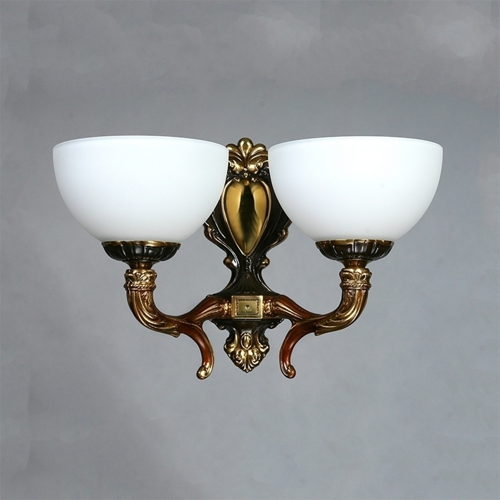 Настенный светильник, выполненный из латуни в блестящей бронзовой отделке и двумя плафонами из белого стекла.