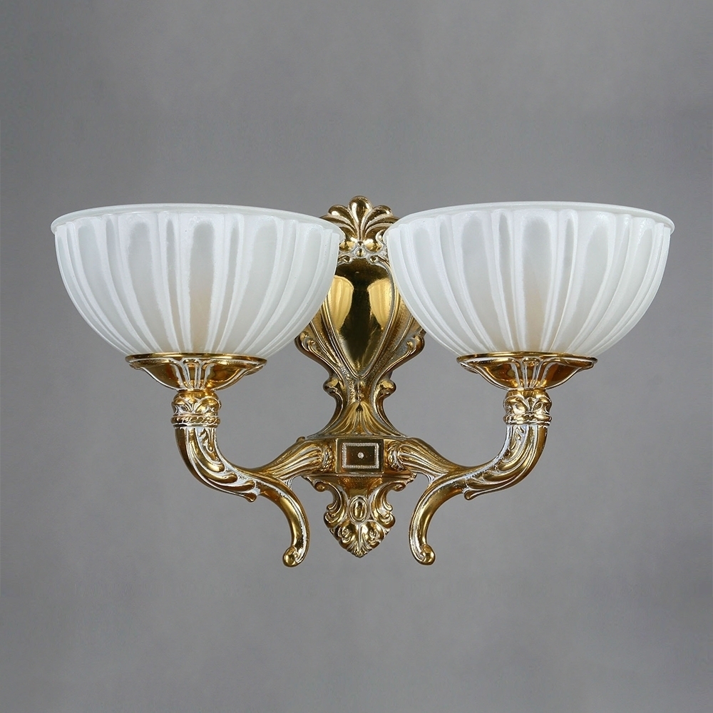 Настенный светильник, выполненный из латуни в отделке "белая патина" с плафонами из стекла белого цвета.