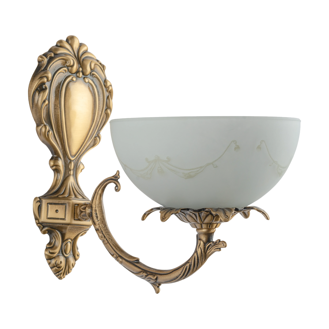 Настенный светильник, выполненный из латуни в матовой бронзовой отделке и плафоном из стекла белого цвета.