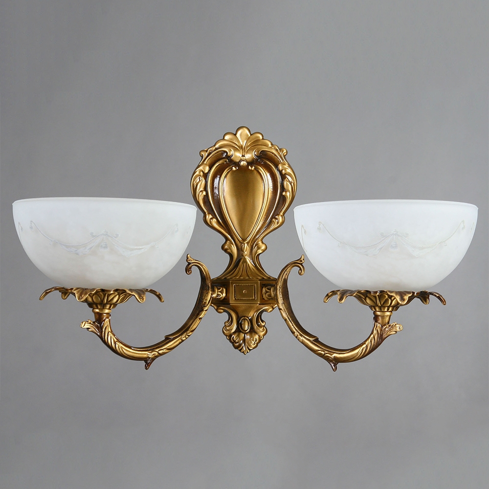 Настенный светильник, выполненный из латуни в матовой бронзовой отделке и двумя плафонами из стекла белого цвета.