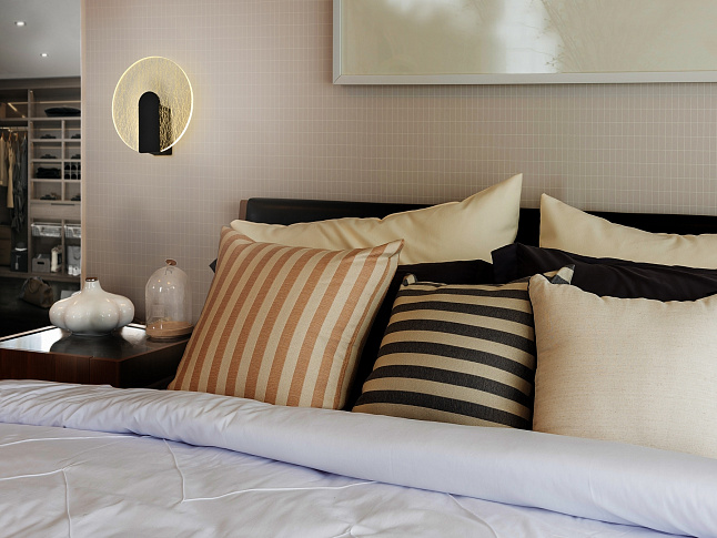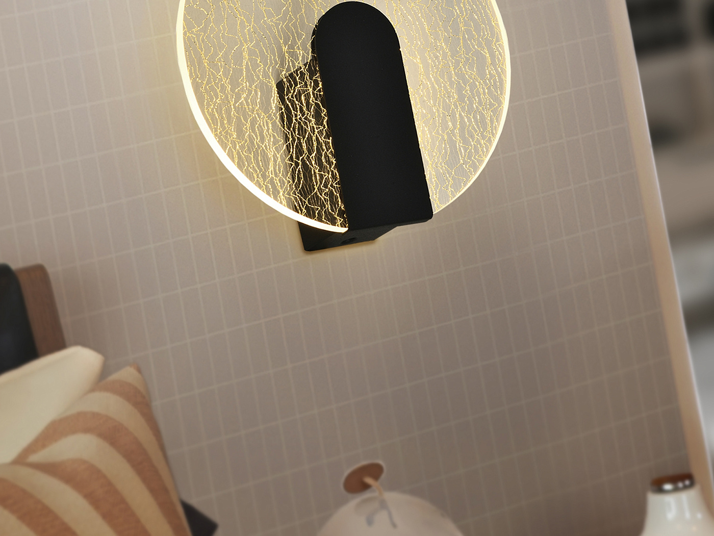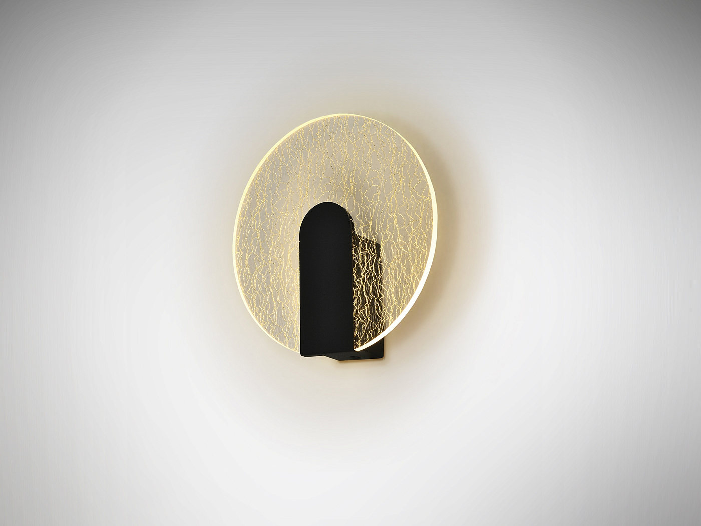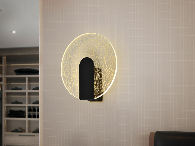 Настенный светильник из металла и алюминия, матовая черная отделка. Круглый рассеиватель из прозрачного акрила, декор микропечатью: текстура в произвольные золотые полосы. Светодиод 5,5 Вт, 450 лм, 3000 К