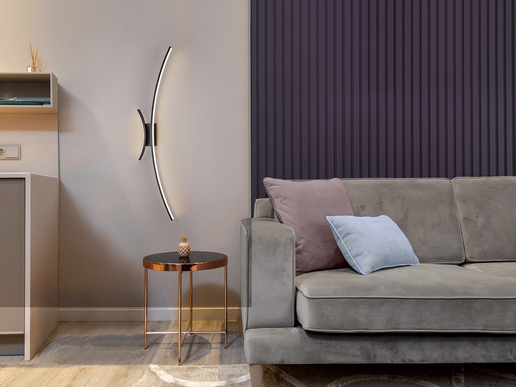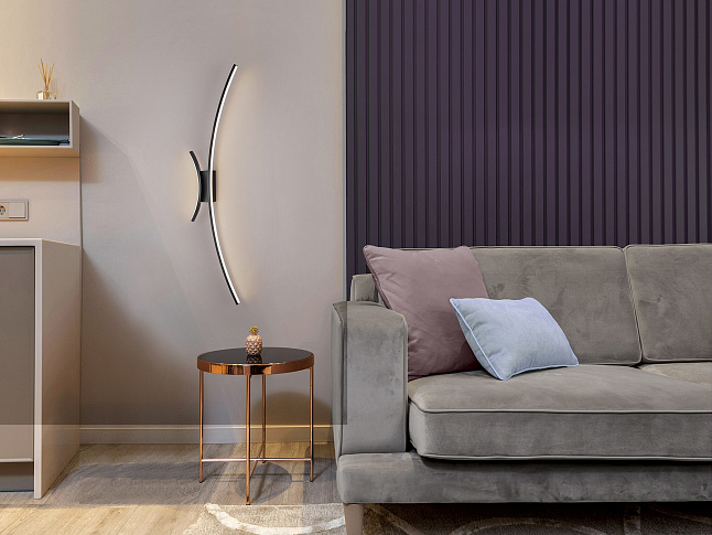 Настенный светильник из алюминия и металла, матово-черное покрытие. Изогнутые рожки со светодиодной подсветкой и рассеивателем из опалового силикона. Светодиод 21 Вт, 1450 лм, 3000 К.
