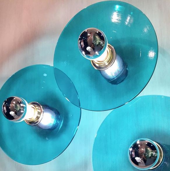 Дизайнерский настенный светильник из золотистого металла с патроном со стеклянным диском темно-синего цвета. Вы можете добавить декоративную лампочку.