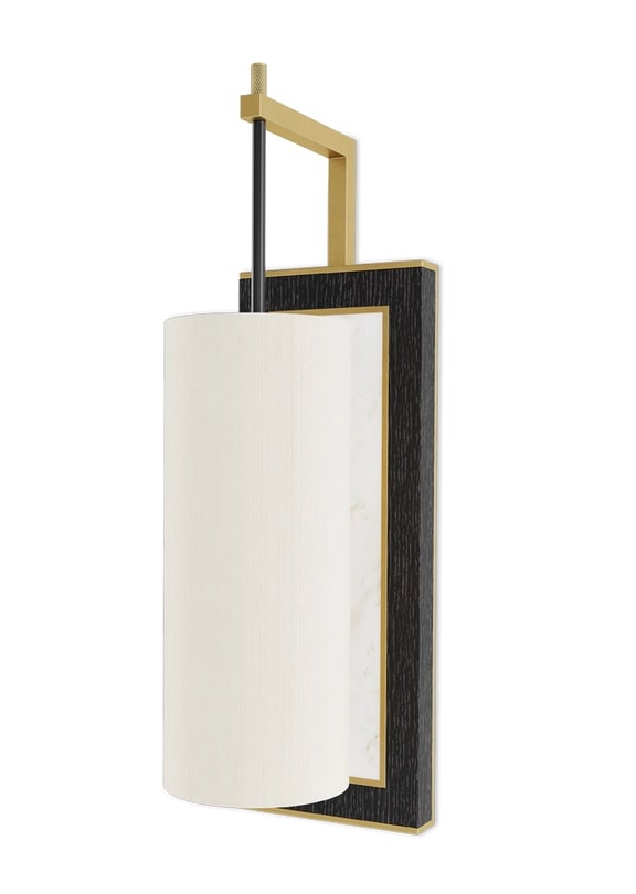 Освободите место у кровати с помощью настенных светильников, таких как лампа KASSEL с задней панелью из шпона дерева, латуни и камня и цилиндрическим абажуром из двойного шелка.