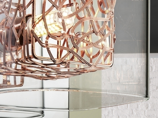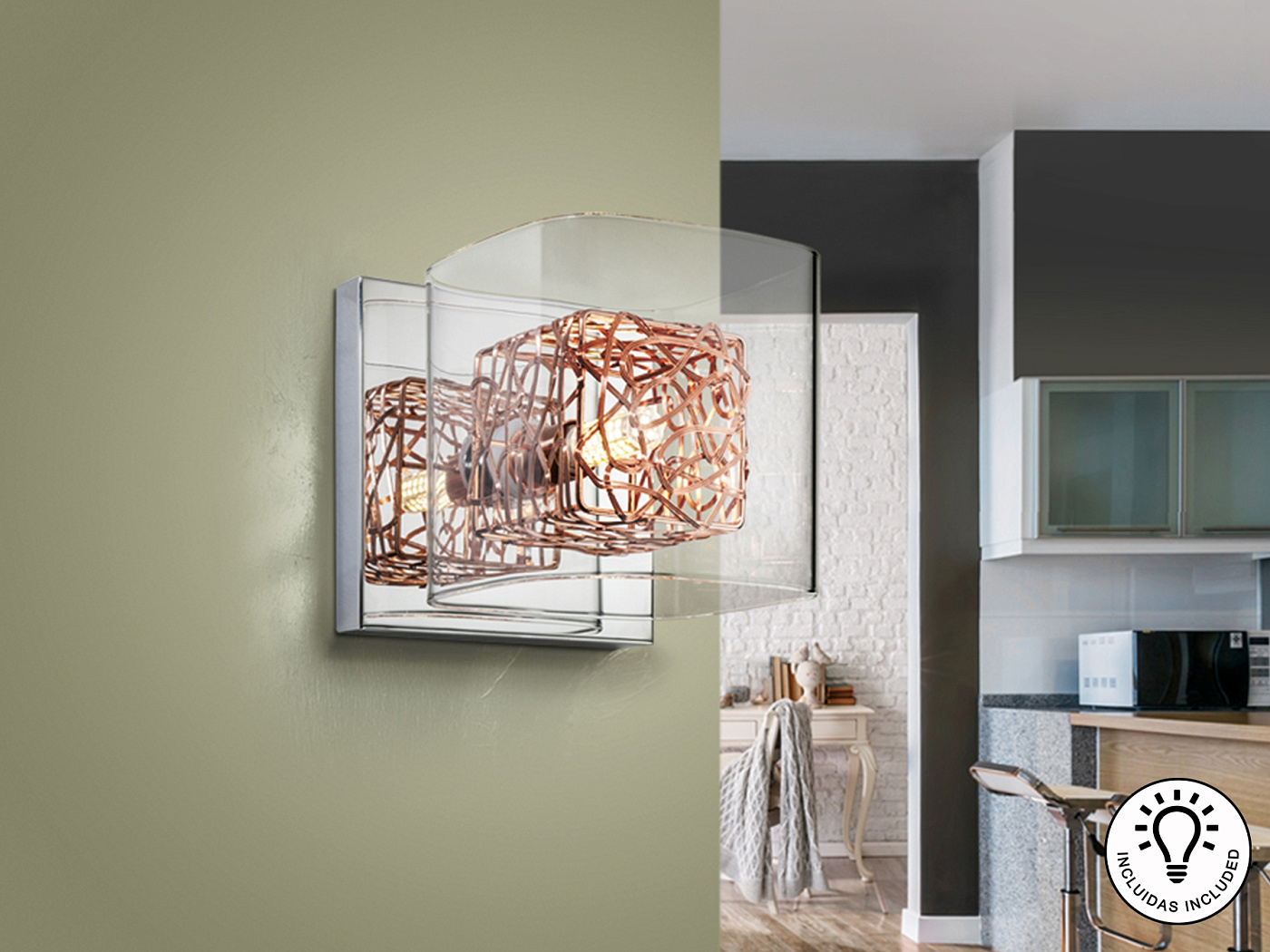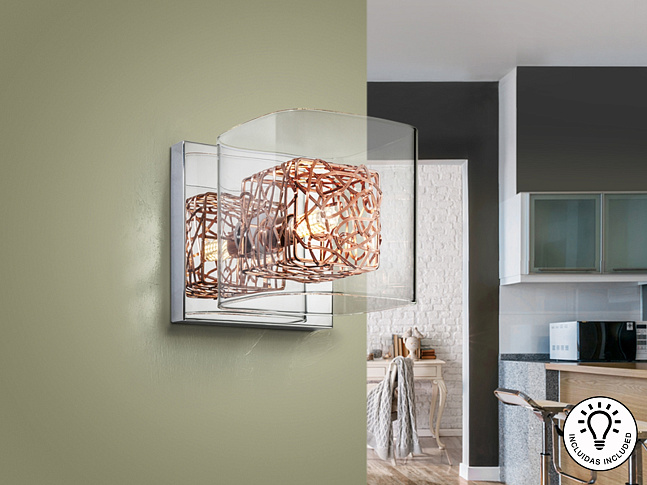 Настенный светильник с 1 лампой из металла с покрытием "хром", внешний плафон из формованного стекла, внутренний плафон в виде куба из медной проволоки. Включает 1 светодиод G9 6 Вт.