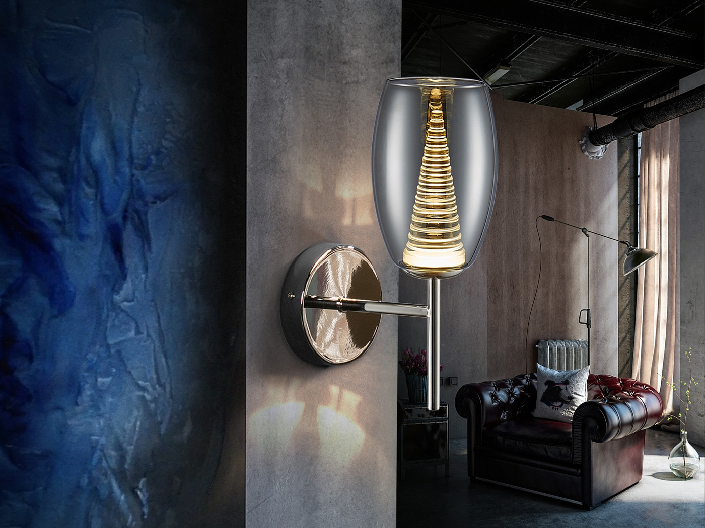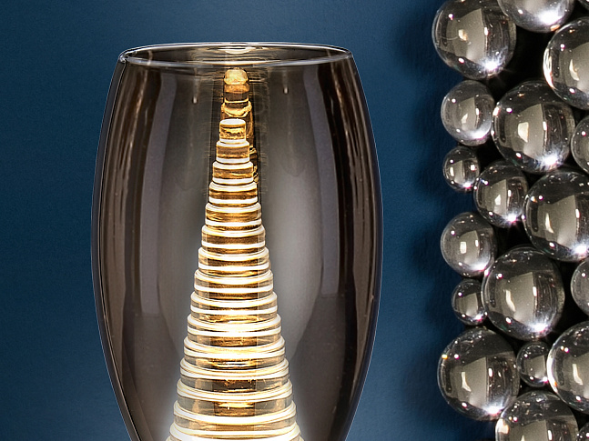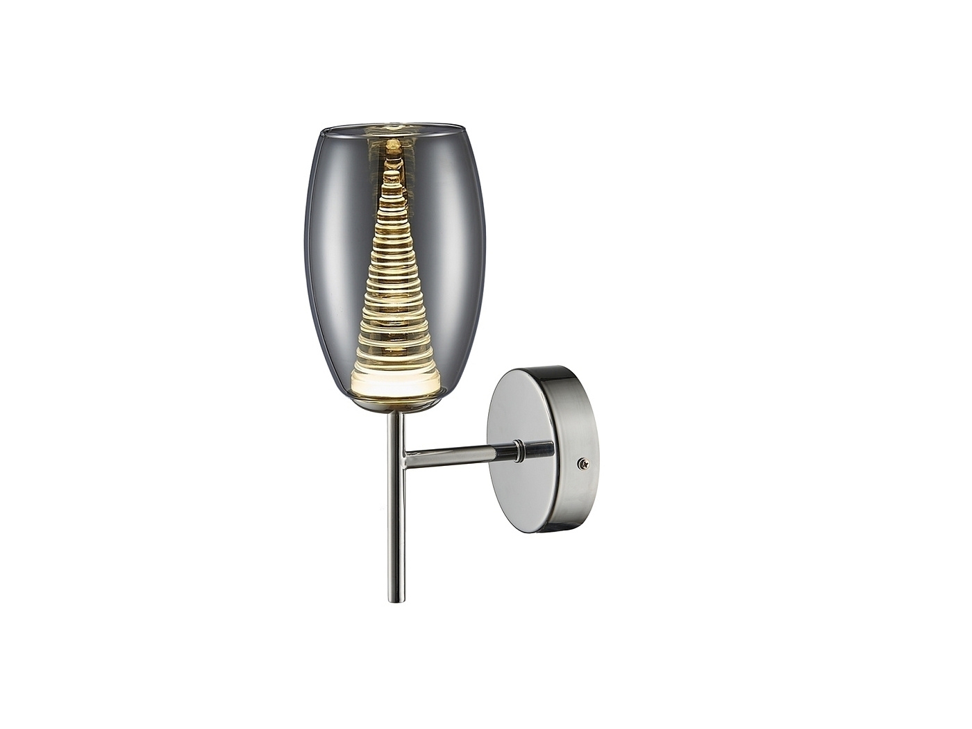 Бра с 1 лампой LED, из металла с покрытием "хром". Двойной абажур: внешний - из зеркального стекла, внутренний - из прозрачного поликарбоната в форме конуса, 5W LED, 3000 K.
