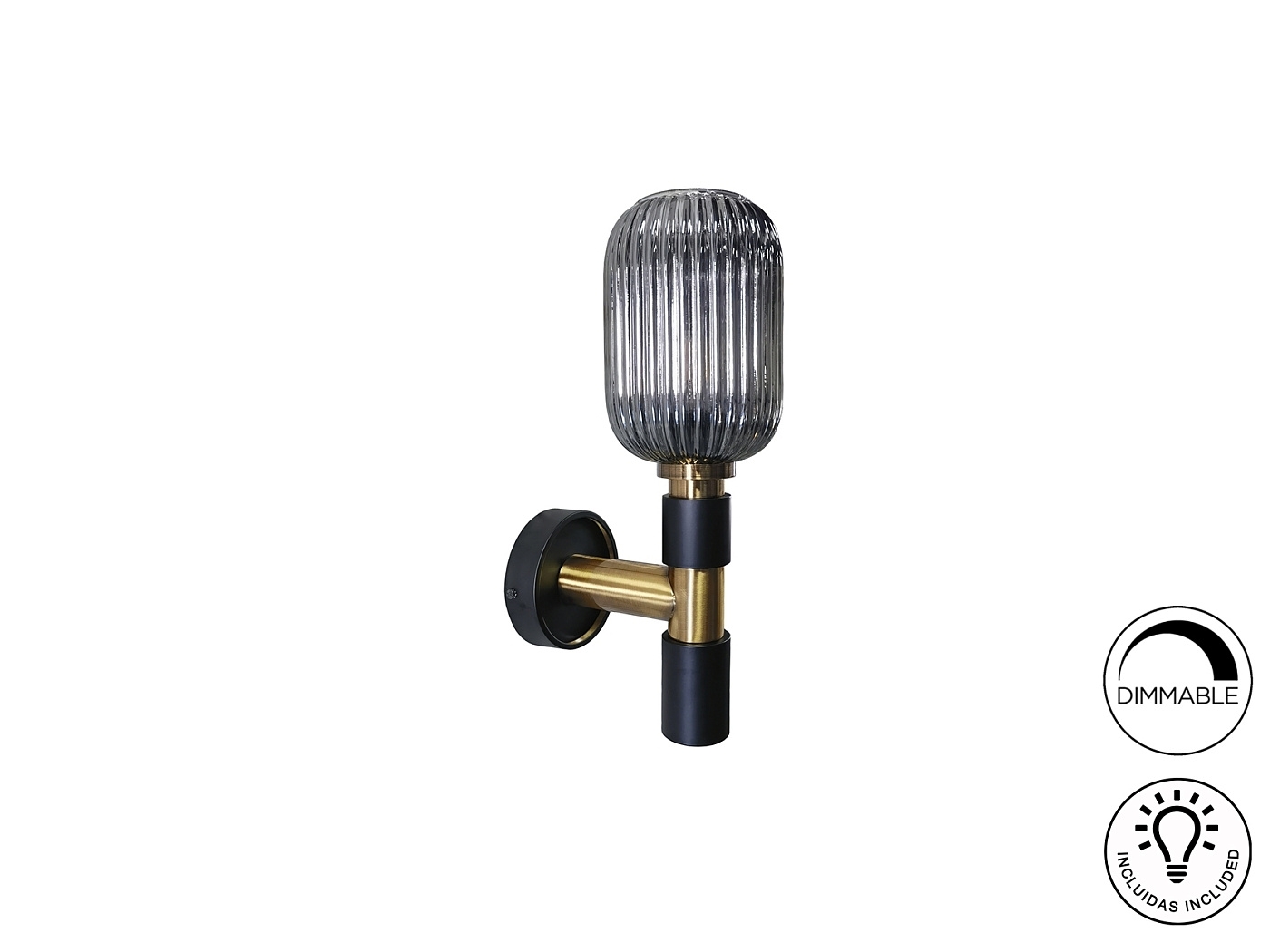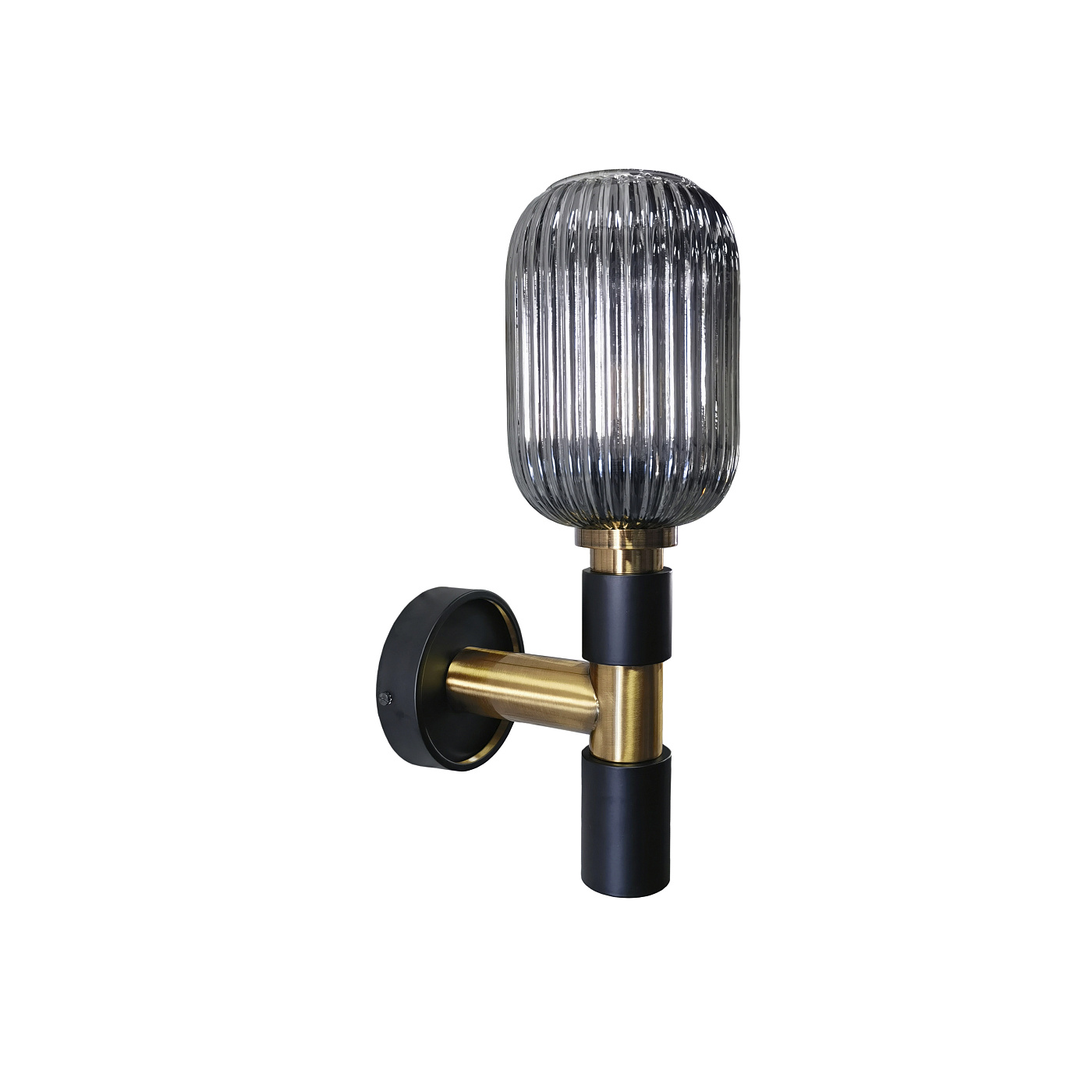 Настенный светильник с 1 лампой из металла, с черной матовой отделкой, с деталями из сатинированной латуни. Абажур из прозрачного формованного стекла с зеркальной отделкой дымчато-серого цвета. ·В комплект входит 1 светодиод E27 мощностью 8 Вт. DIMABLE.