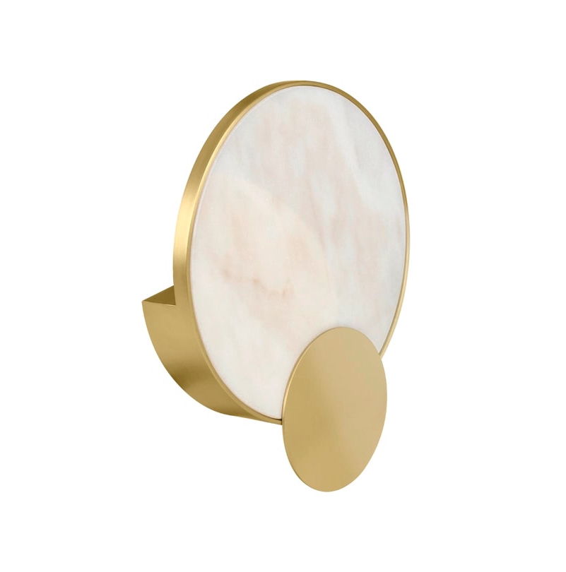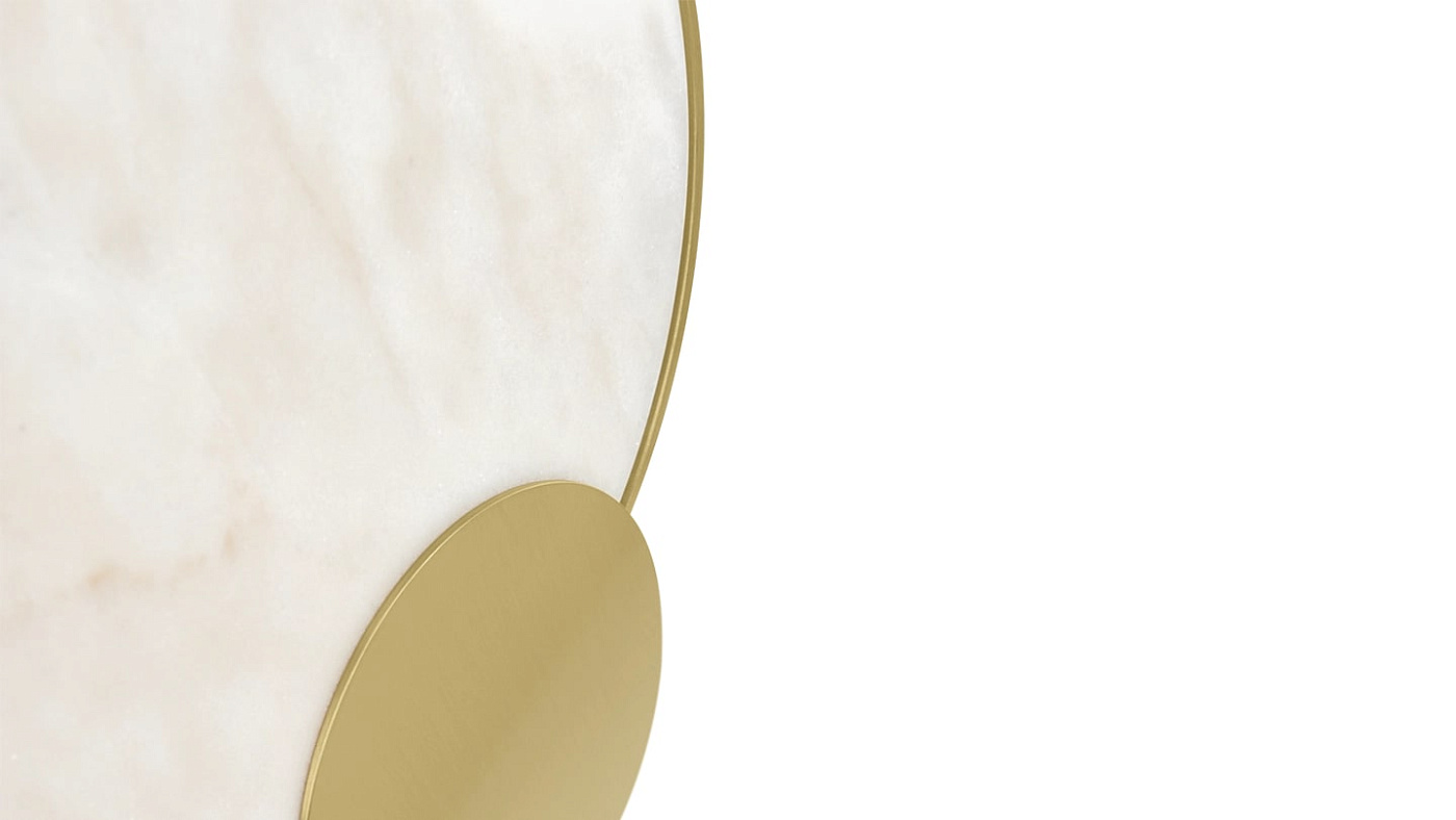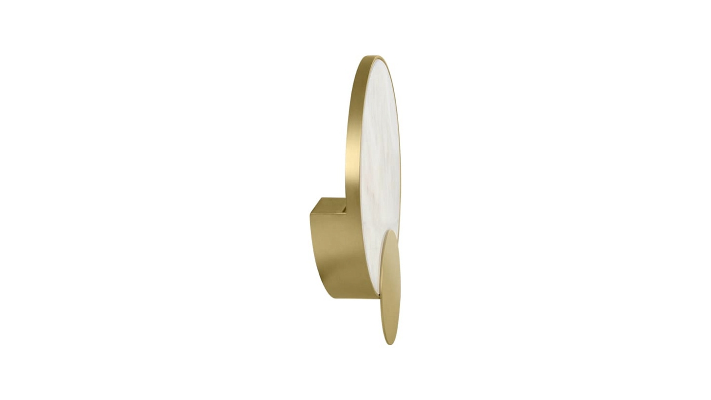 Теплый камень с прожилками и матовая латунь сочетаются в нашем настенном светильнике PETRA, где накладывающиеся друг на друга диски создают тонкий геометрический дизайн, создающий атмосферное свечение.