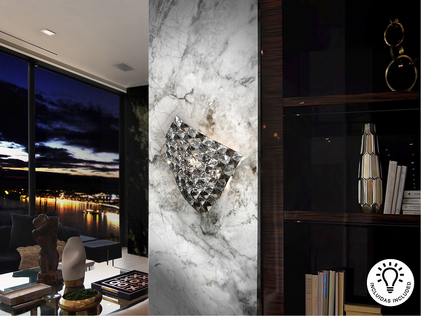 Бра из хромированного металла, плафон из скреплённых между собой кристаллов прозрачного гранёного стекла K9 и кристаллов дымчатого цвета, в стоимость входит 1 светодиод G9 6 Вт.