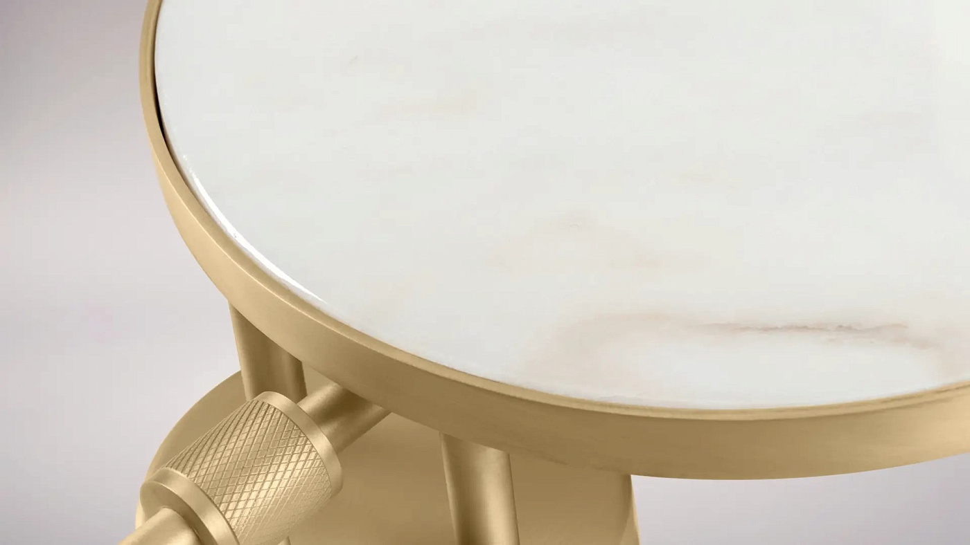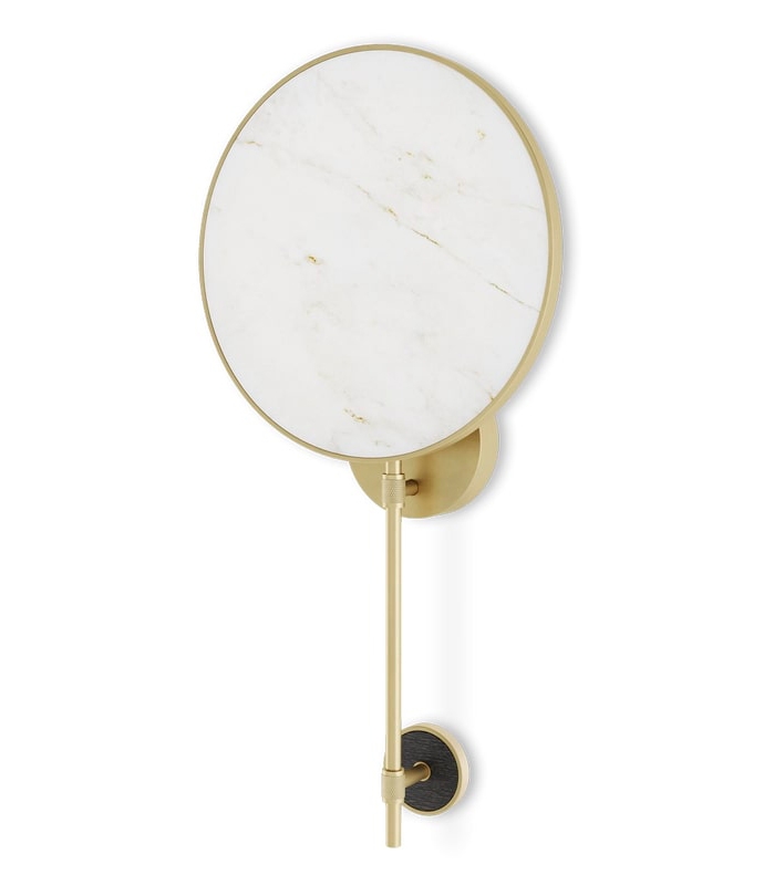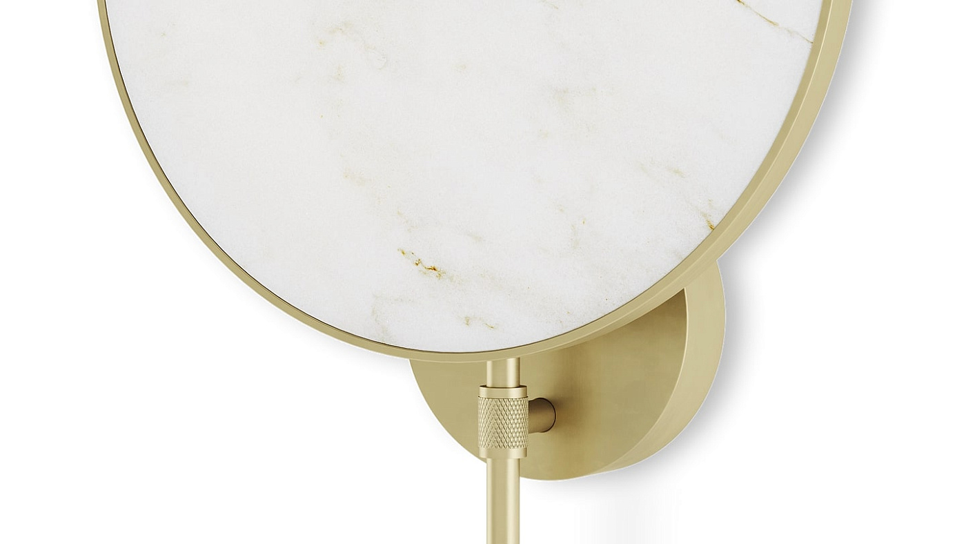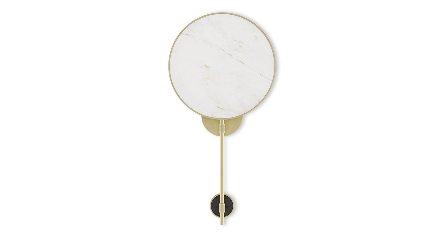 Настенный светильник TANGIER из матовой латуни и мрамора при освещении напоминает дикое грозовое небо и создает атмосферное свечение вокруг.