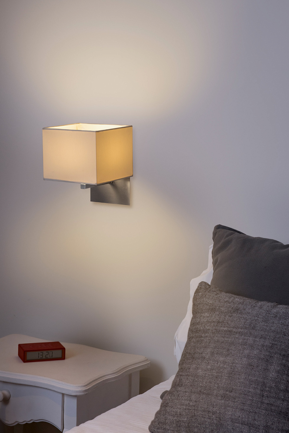 Бра имеет сборную конструкцию. Оно состоит из металлической стойки и тканевого абажура.
