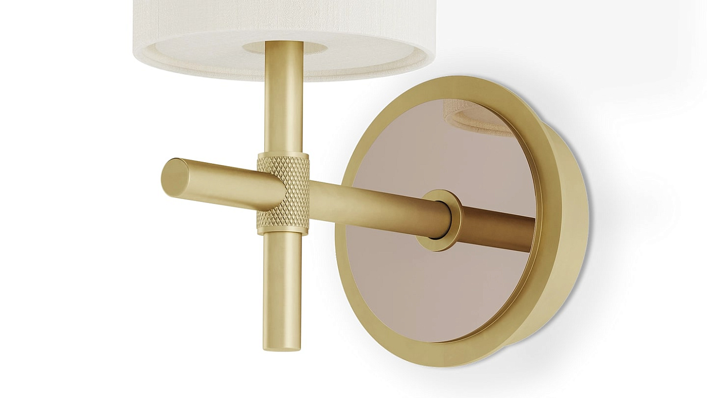 Изысканный настенный светильник VIENNA, сочетающий в себе неподвластный времени стиль и сдержанный гламур, имеет цилиндрический двойной шелковый абажур с рассеивателем и урезанную конструкцию из матовой латуни, приподнятую вставным кругом бронзового зеркала.