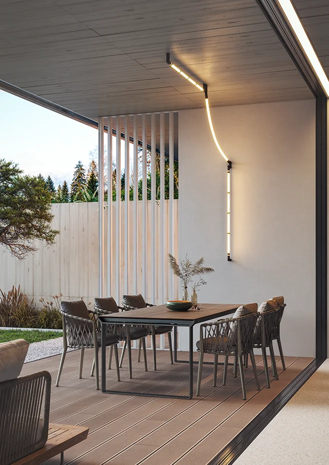 Освещенная силиконовая трубка, поддерживаемая металлической конструкцией, которая позволяет вращаться для обеспечения прямого или непрямого света. Подходит для создания композиций до трех единиц с одним удаленным драйвером. Удаленный драйвер должен быть помещен в коробку IP/65 или в сухое место. Дополнительный поверхностный навес с распределительной коробкой IP/65 для драйвера. Двухслойное покрытие для высокой устойчивости к коррозии и другим морским условиям окружающей среды
