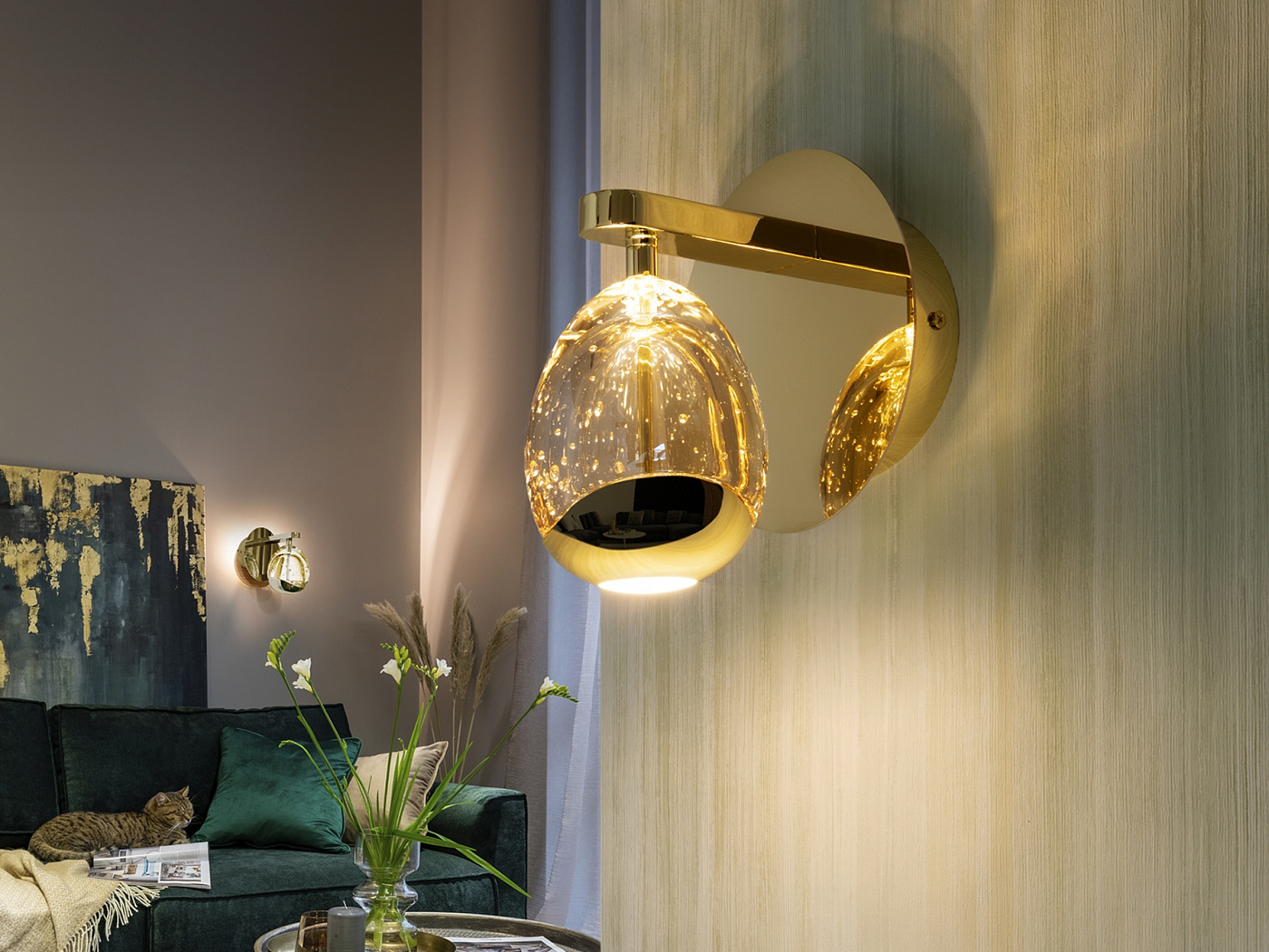 Настенный светильник с 1 светодиодом, выполнен из металла с золотой отделкой. Абажур каплевидной формы из массивного бокала для шампанского с декоративными пузырьками внутри. Светодиод мощностью 5 Вт. 480лм. 3000 тыс.