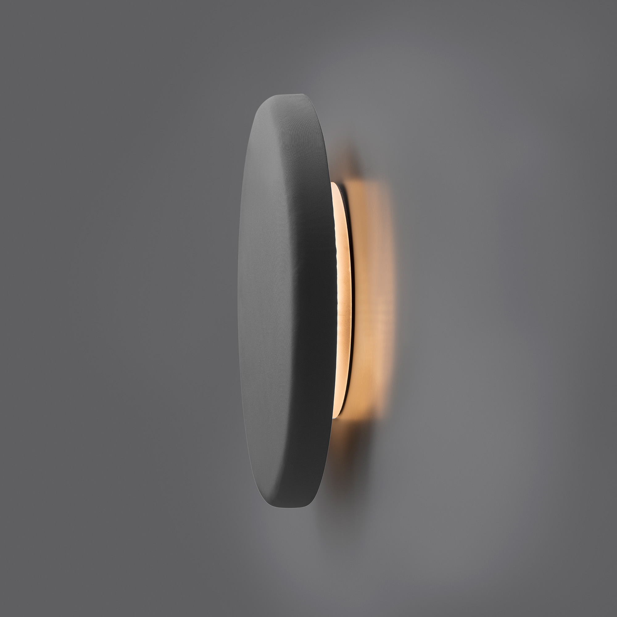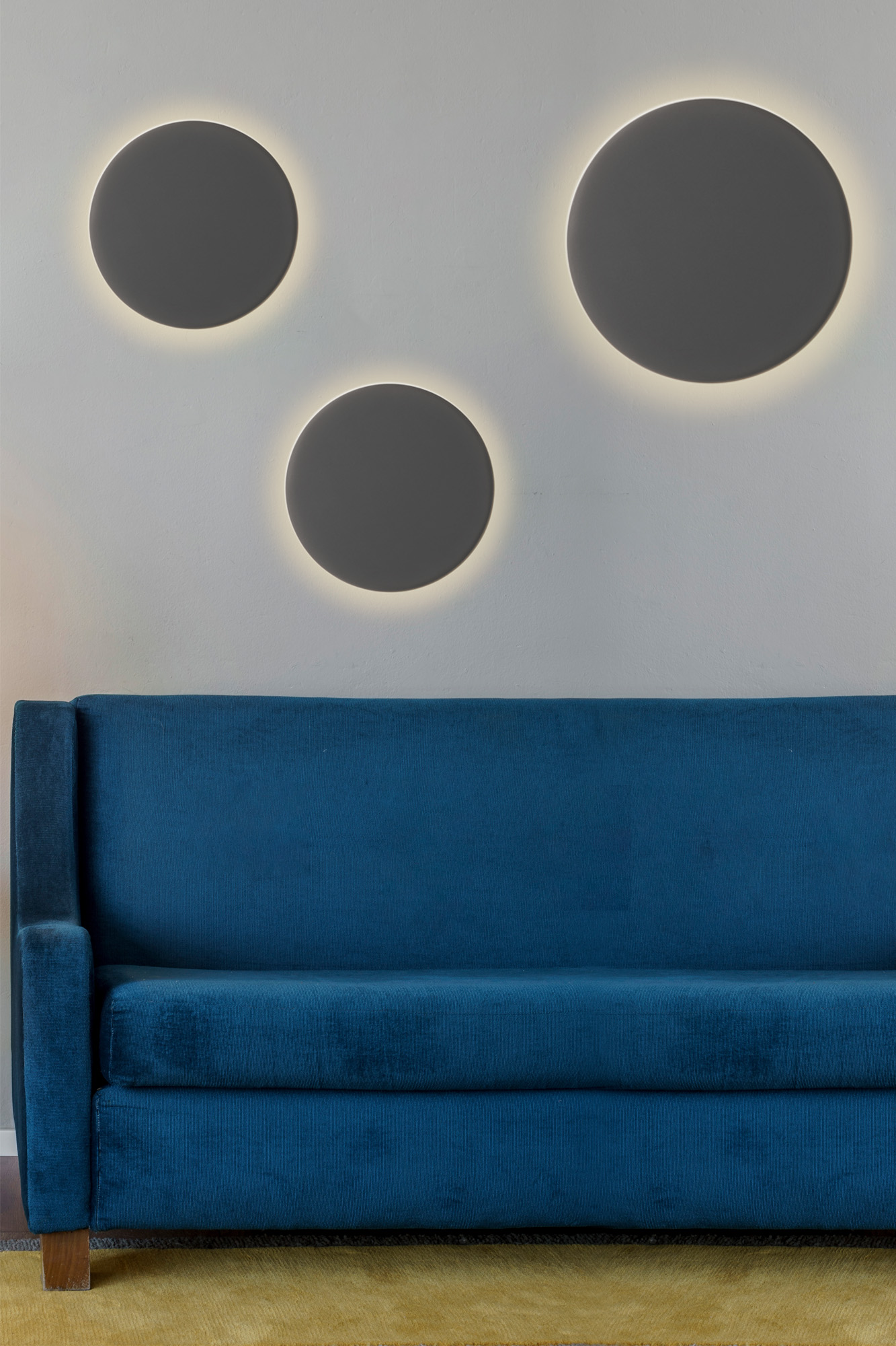 TOU - это дизайнерский настенный светильник, созданный Faro Lab. Он изготовлен из алюминия и имеет покрытие из ткани и поролона. Свет косвенно излучается круглым лучом его конструкции. Это позволяет создавать разные комбинации и красивую ванну из света. Его можно найти в двух размерах и цветах. Это серая версия диаметром 35 см.