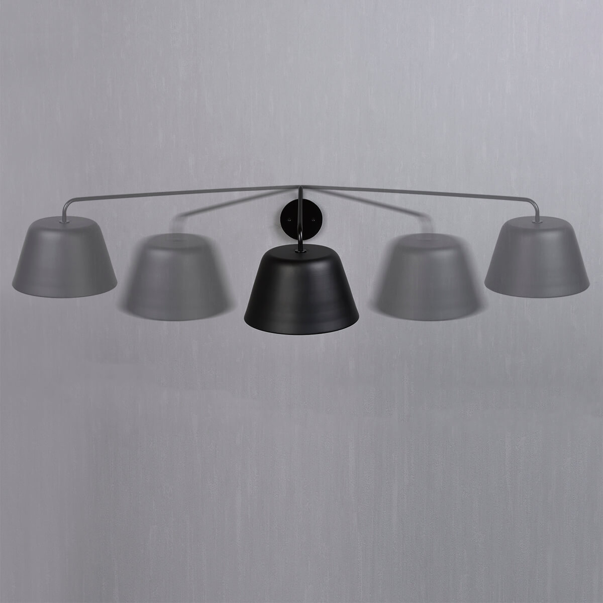 Настенный светильник на основе мобильного кронштейна длиной 50 см, к которому подвешен металлический абажур Ø22 см. Доступен в нескольких цветах.
