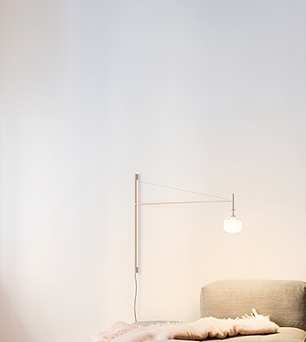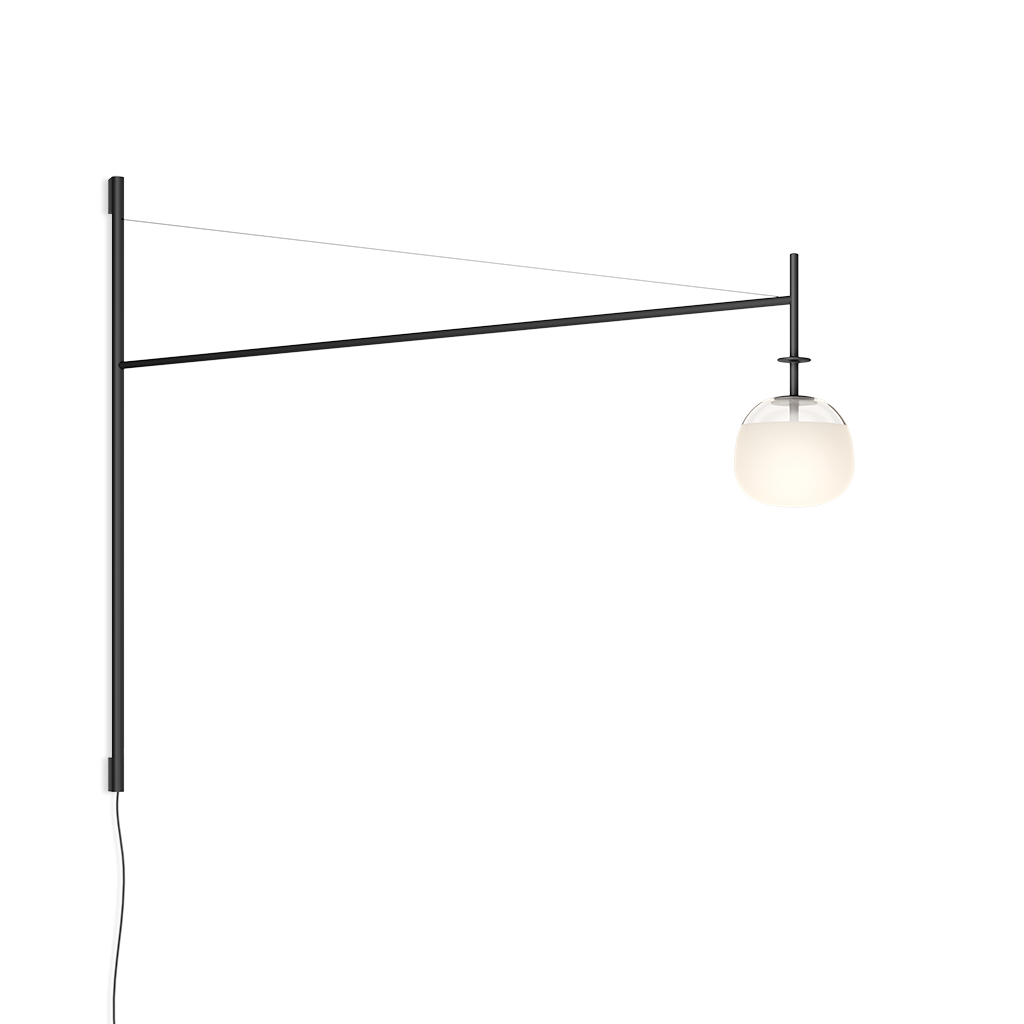 Настенный светильник. Регулируемый стержень выходит из основания, прикрепленного к стене, с диффузором из дутого стекла и натяжным тросом, который позволяет точно регулировать высоту стеклянного тюльпана. Соединение со штекером. Светодиодный источник света.