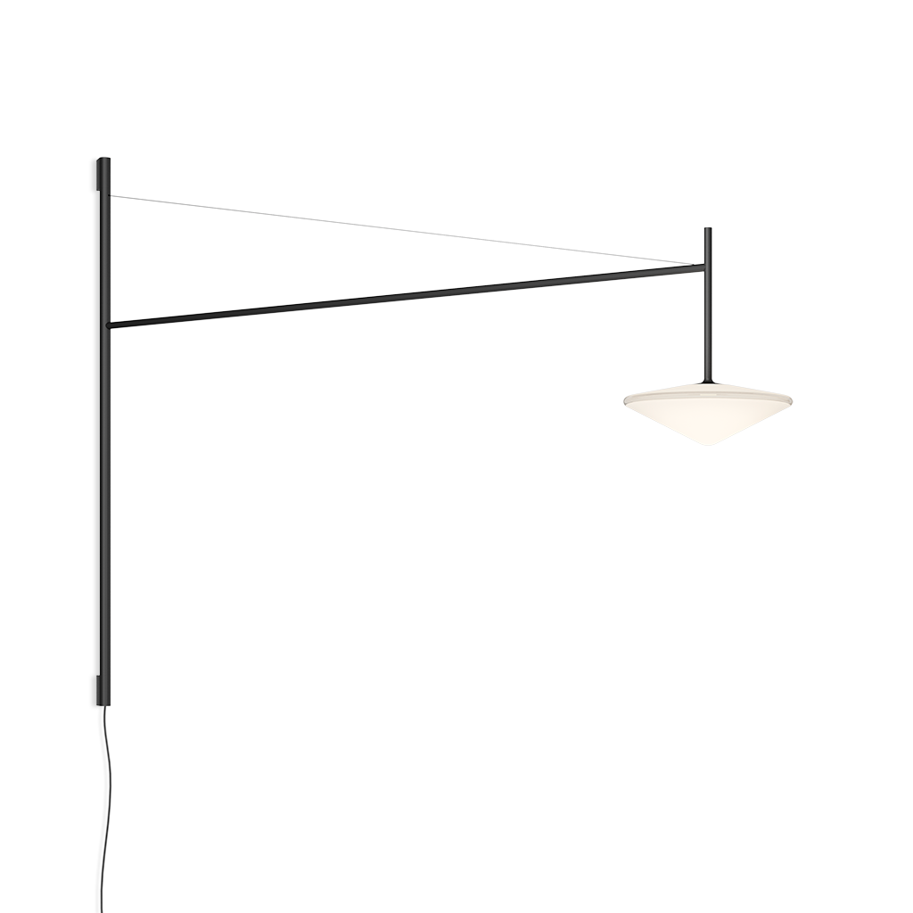 Настенный светильник. Регулируемый стержень выходит из основания, прикрепленного к стене, с диффузором из дутого стекла и натяжным тросом, который позволяет точно регулировать высоту стеклянного тюльпана. Соединение со штекером. Светодиодный источник света.