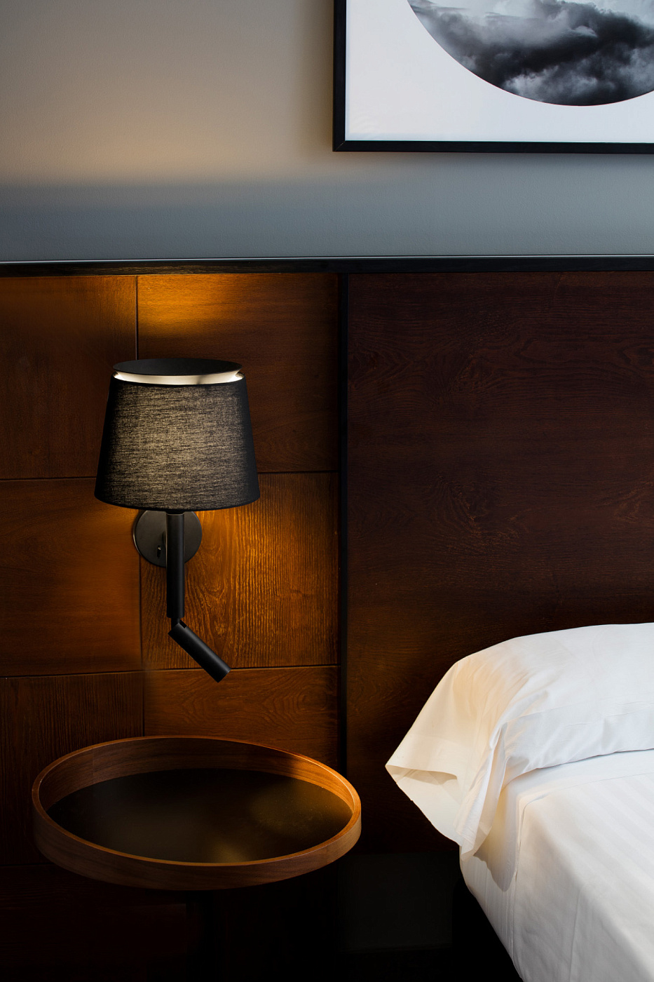 SAVOY - черный настенный светильник с черным текстильным плафоном для внутреннего освещения, разработанный Исааком Пиньейро. Его структура характеризуется кольцом, расположенным в верхней части, где отражается свет, создавая красивое отражение. Благодаря светодиодному считывателю он дополняет функцию внешнего освещения функцией чтения.