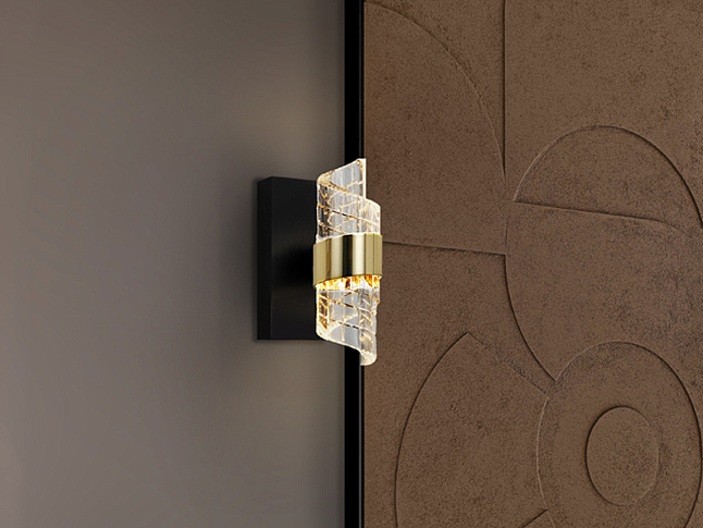 Настенный светильник с 1 светодиодной лампой. Изготовлен из металла с матово-черной и ярко-золотой отделкой. Абажур со спиральным дизайном из формованного и резного акрила. Светодиоды 7 Вт. 656 лм. 3000 К