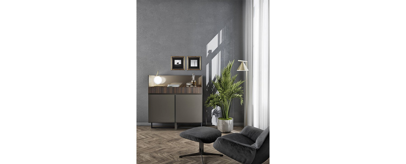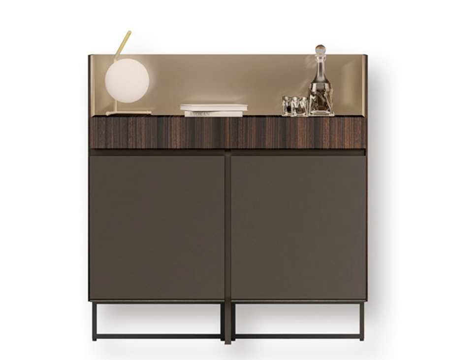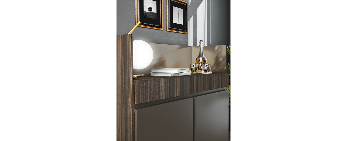 Шкаф совершенно новый, так как в него встроены боковые накладки, которые обеспечивают сдержанность всей группы. Использование стеклянной бронзы во внутренней части накладок также придает группе нотку дизайна.