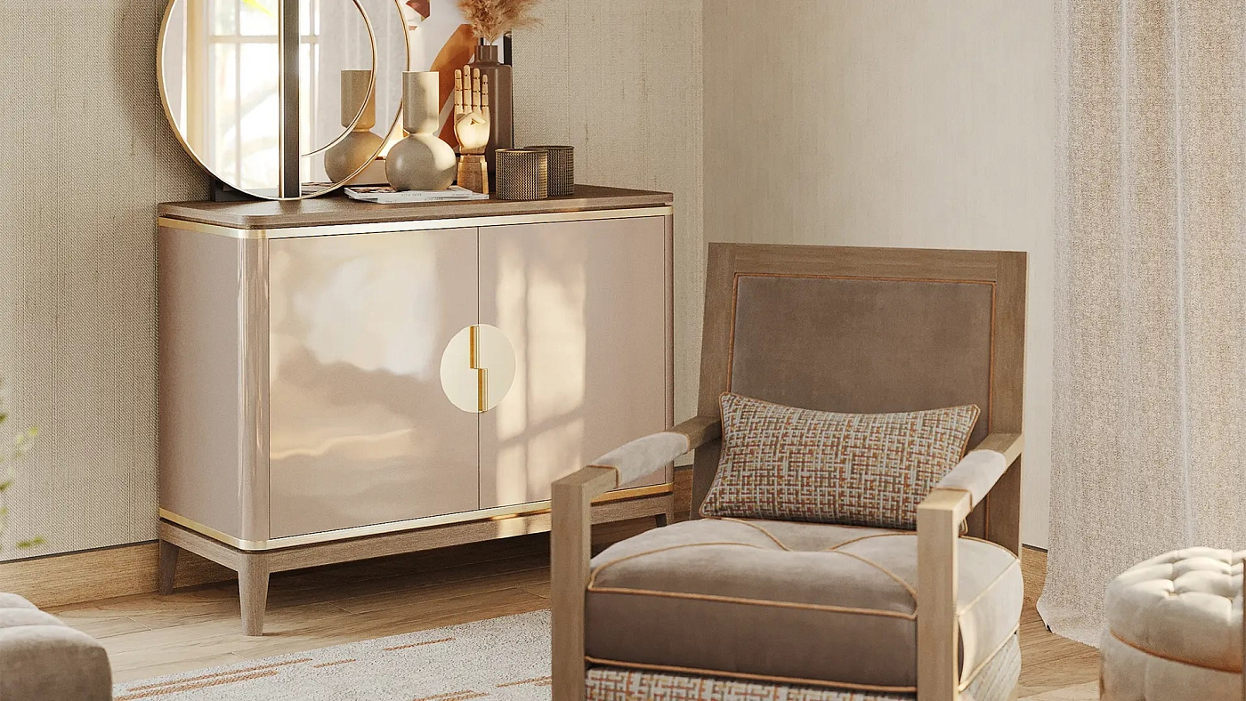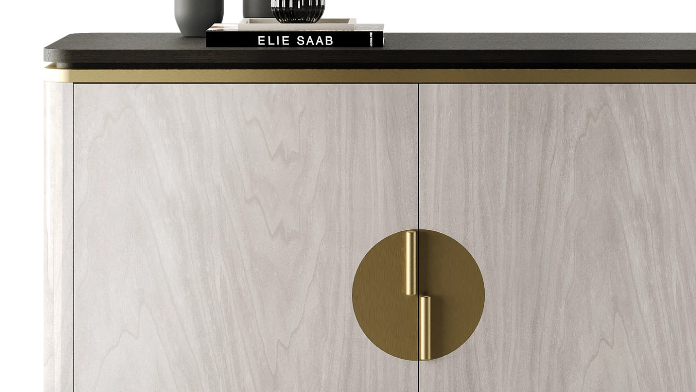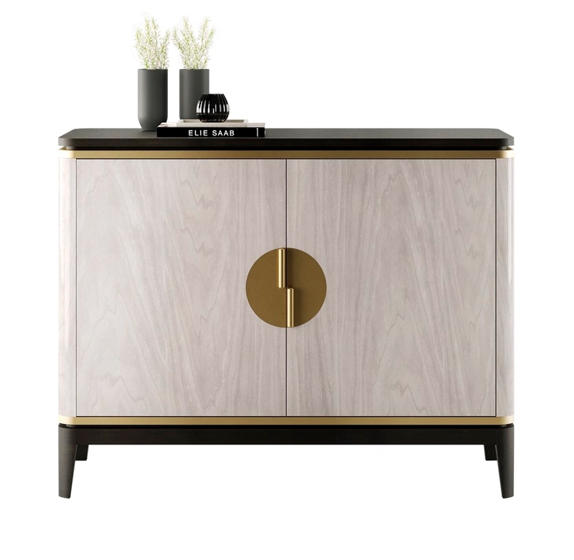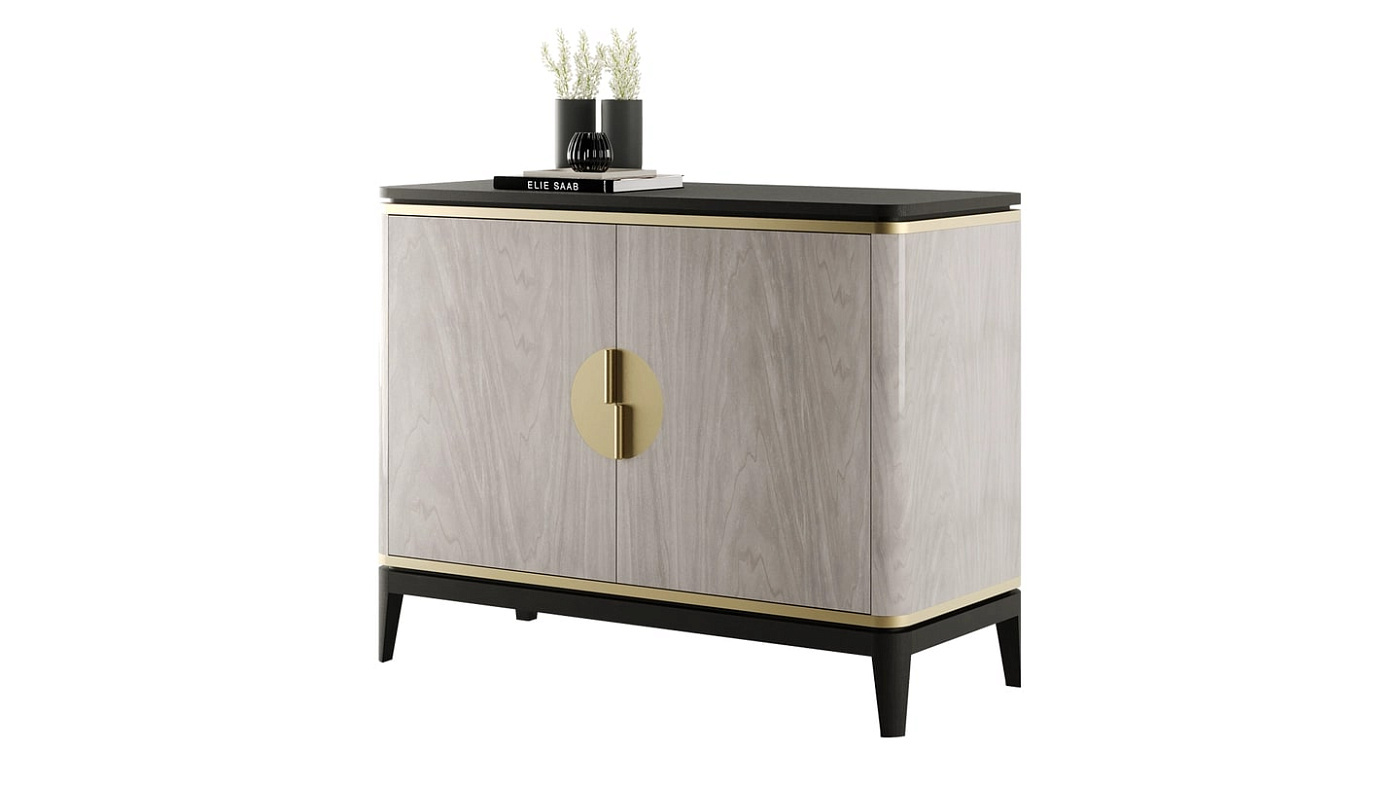 Попрощайтесь с неприглядным беспорядком с помощью нашего безупречного шкафа BILBAO. Выполненный из массива темного дерева и шпона с богатыми прожилками, он изысканно отделан деталями из матовой латуни и привлекательными ручками.