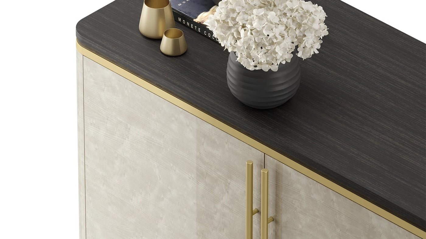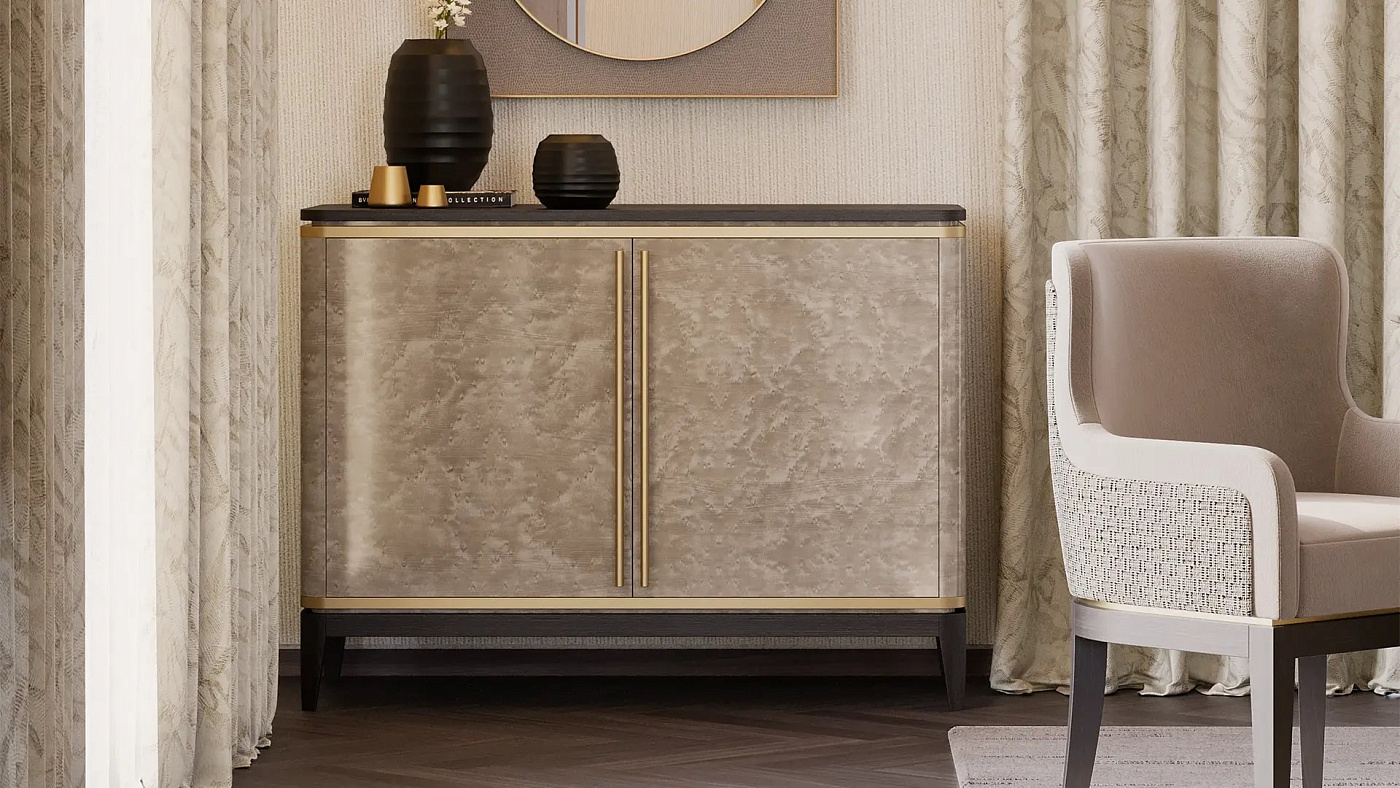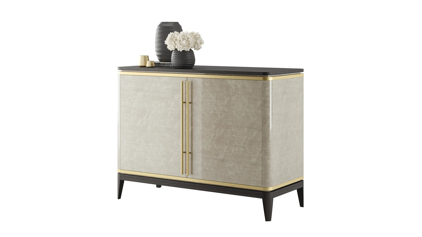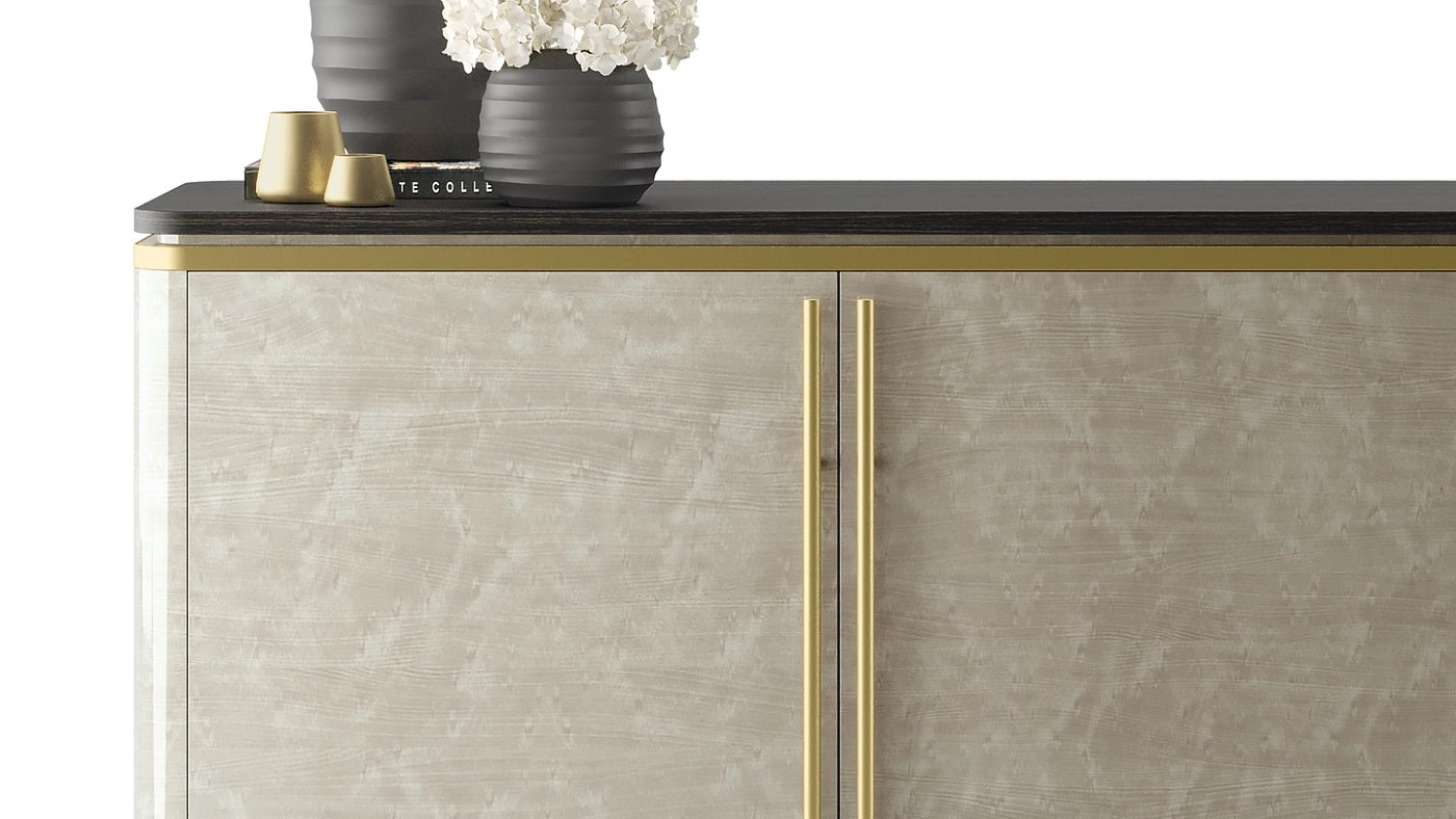 Наш шкаф SIENA не только отделан уникальным деревянным шпоном, но и отделан изящными латунными ручками, которые дополняют латунную отделку и придают легкость общему дизайну.