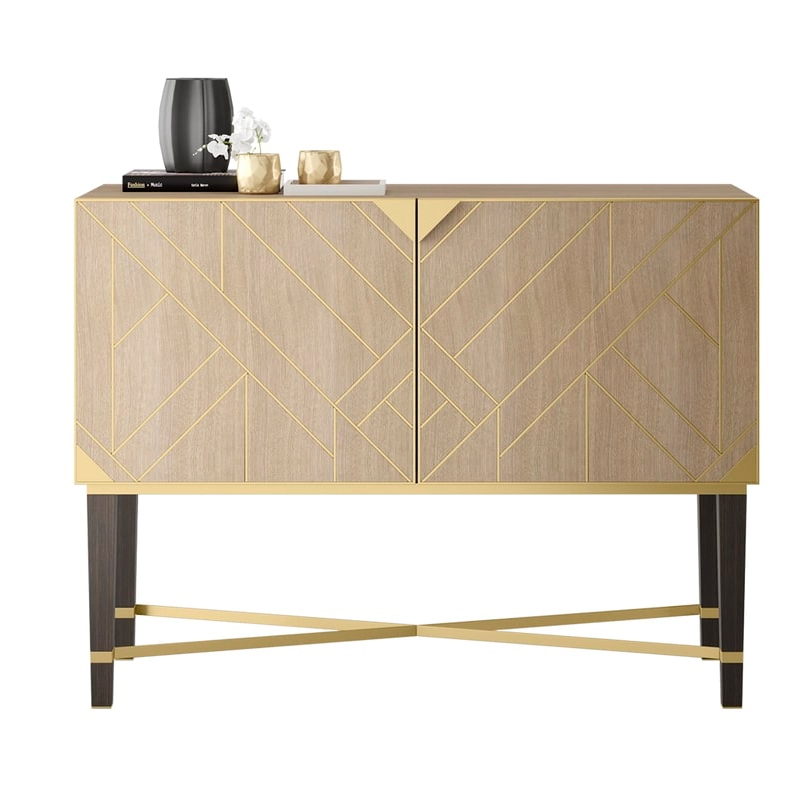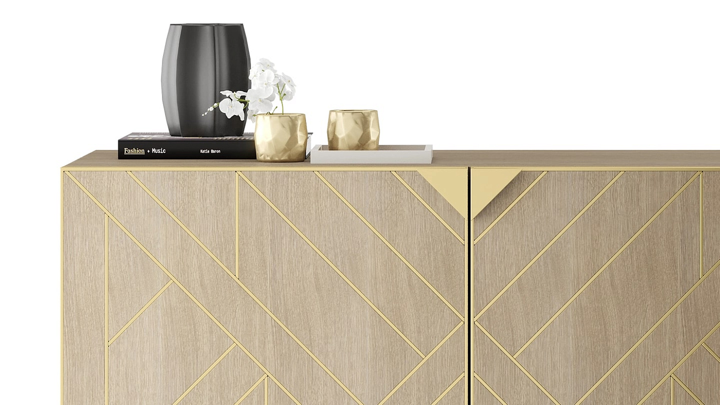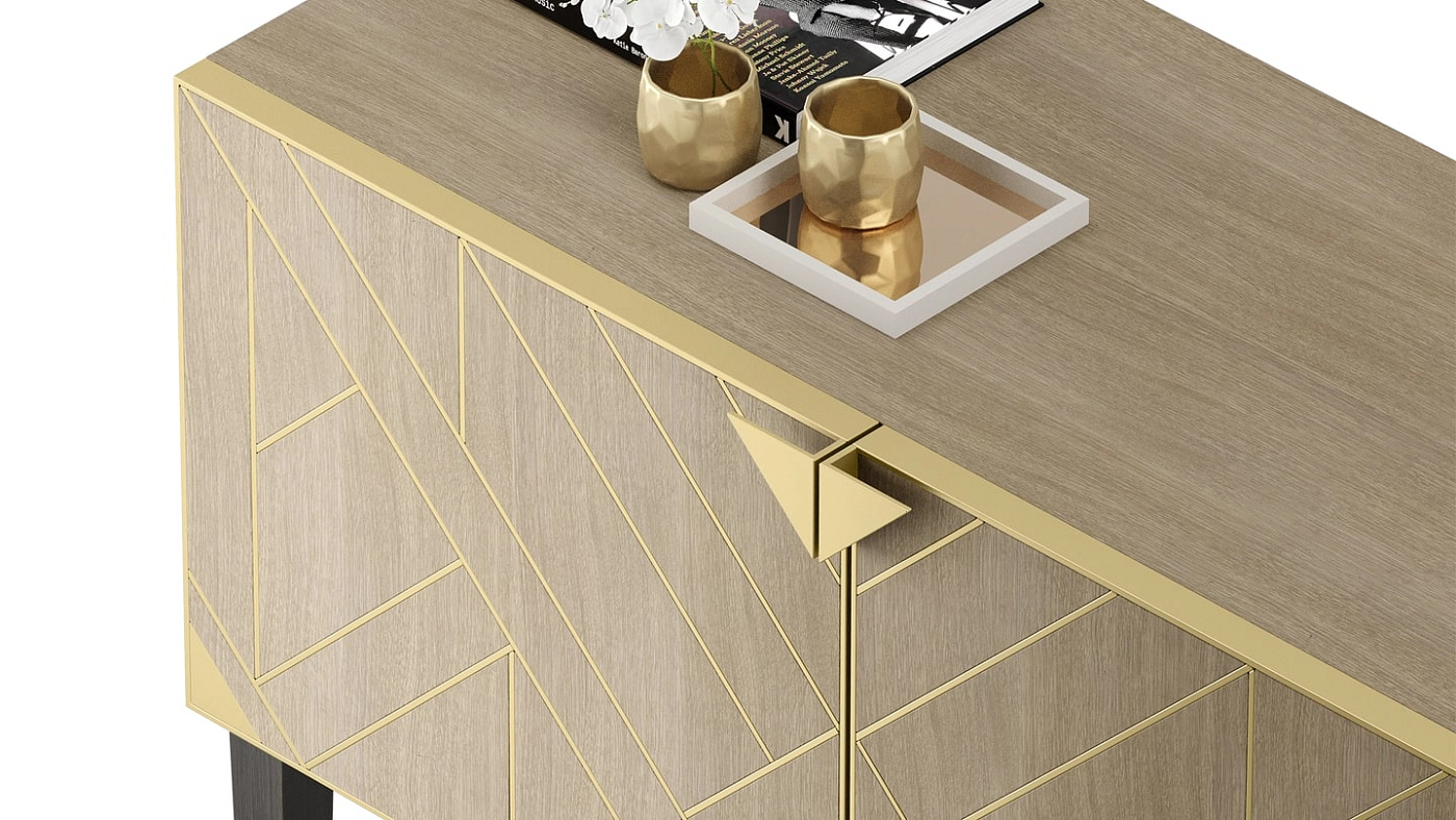 Стильный сервант SIRMIONE, напоминающий сервант для бижутерии, привносит драматизм в процесс хранения. Двойные двери, облицованные деревянным шпоном, украшены рисунком в стиле ар-деко, выполненным из матовой латуни, в то время как Х-образная скоба для ножек внизу создает визуальный интерес.