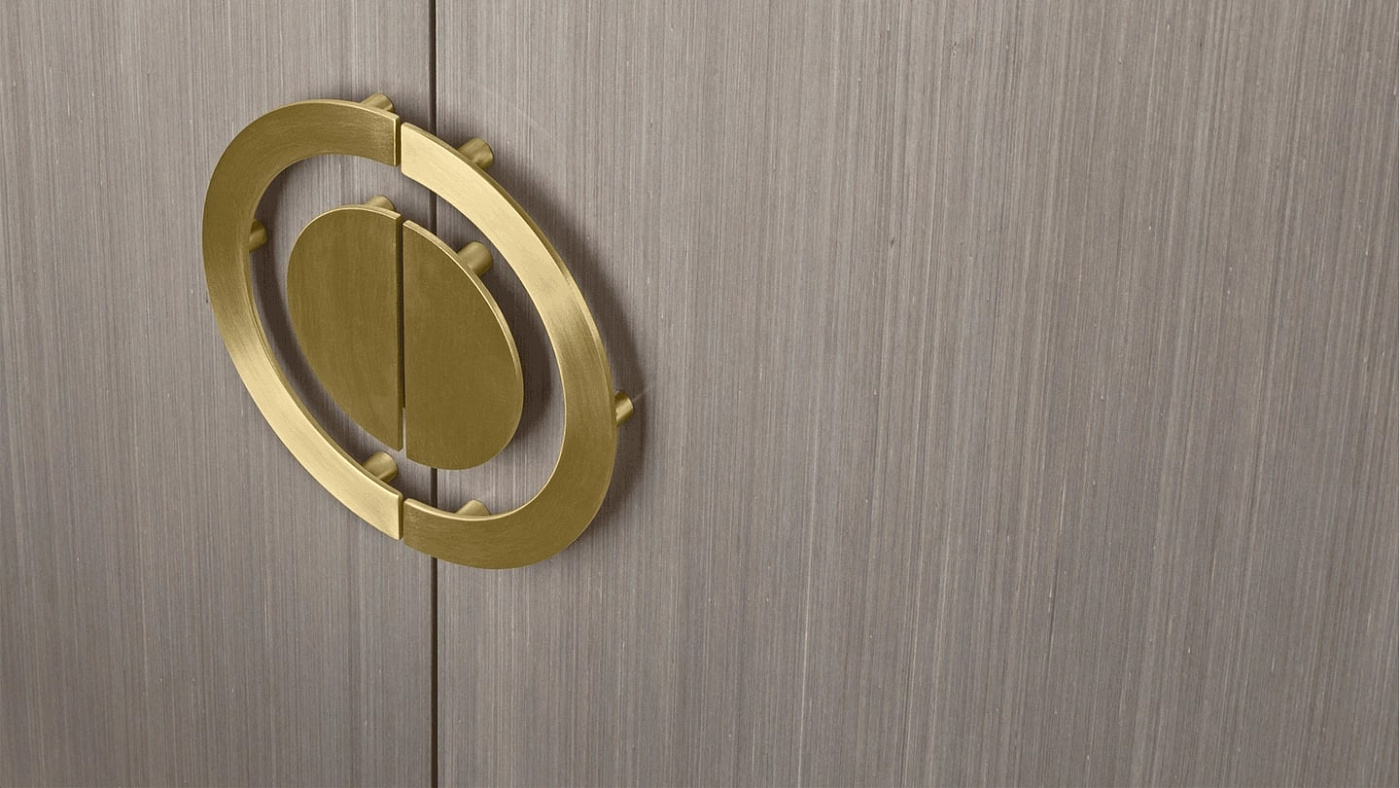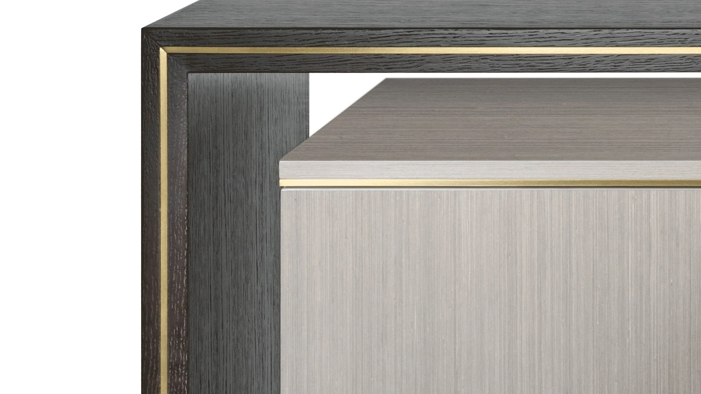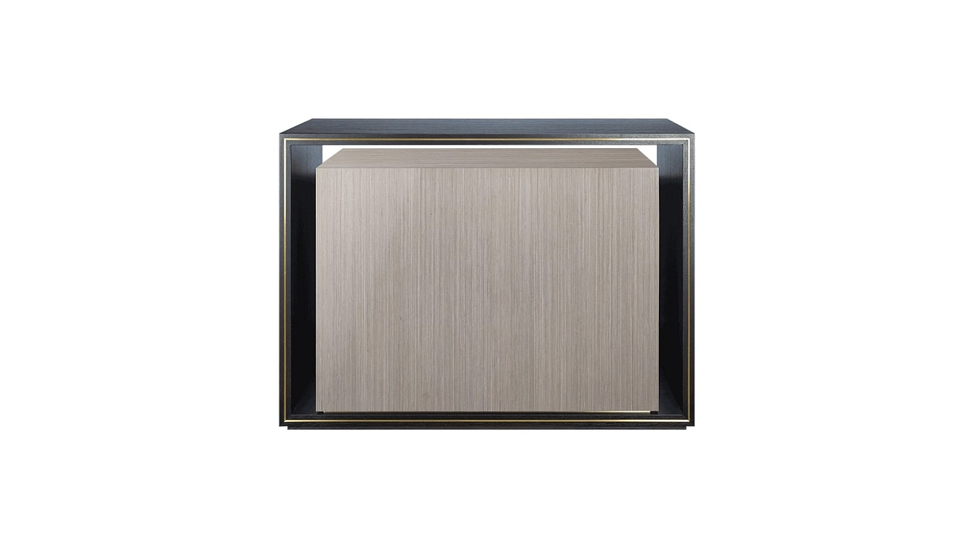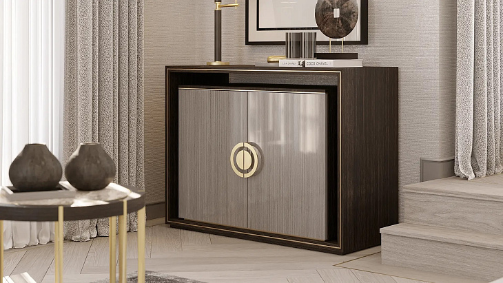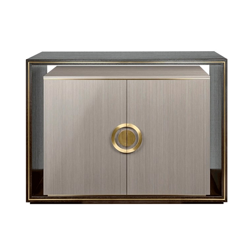 Уникальный шкаф SYROS отказывается от ножек или основания в пользу каркасного обрамления, выполненного из шпона темного дерева. Это обрамляет шкаф с чистой облицовкой из более светлого глянцевого шпона, в то время как элементы из матовой латуни объединяют их.