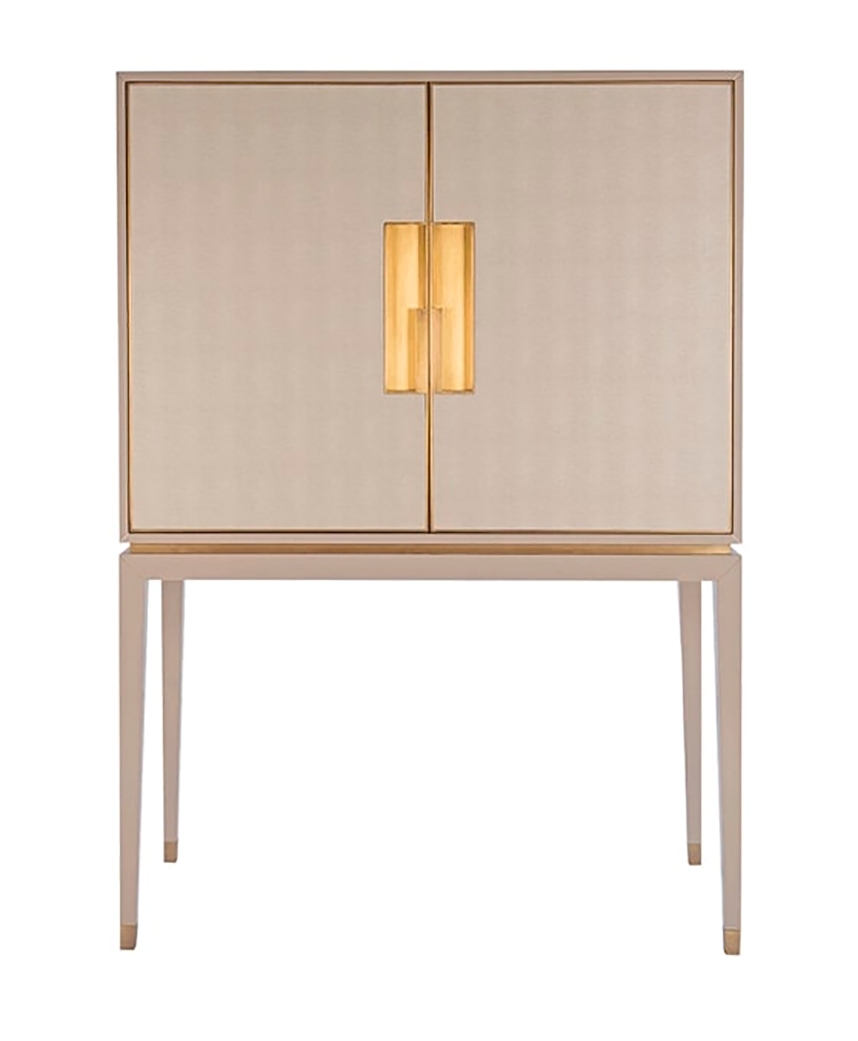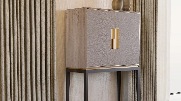 Неожиданное использование изысканных материалов придает высокому шкафу ALPINE спокойную роскошь. Обратите внимание на обтянутые кожей дверные фасады, ручки и отделку из матовой латуни, зеркальную внутреннюю спинку и отделанный замшей выдвижной ящик. Хранилище никогда не выглядело таким учтивым.