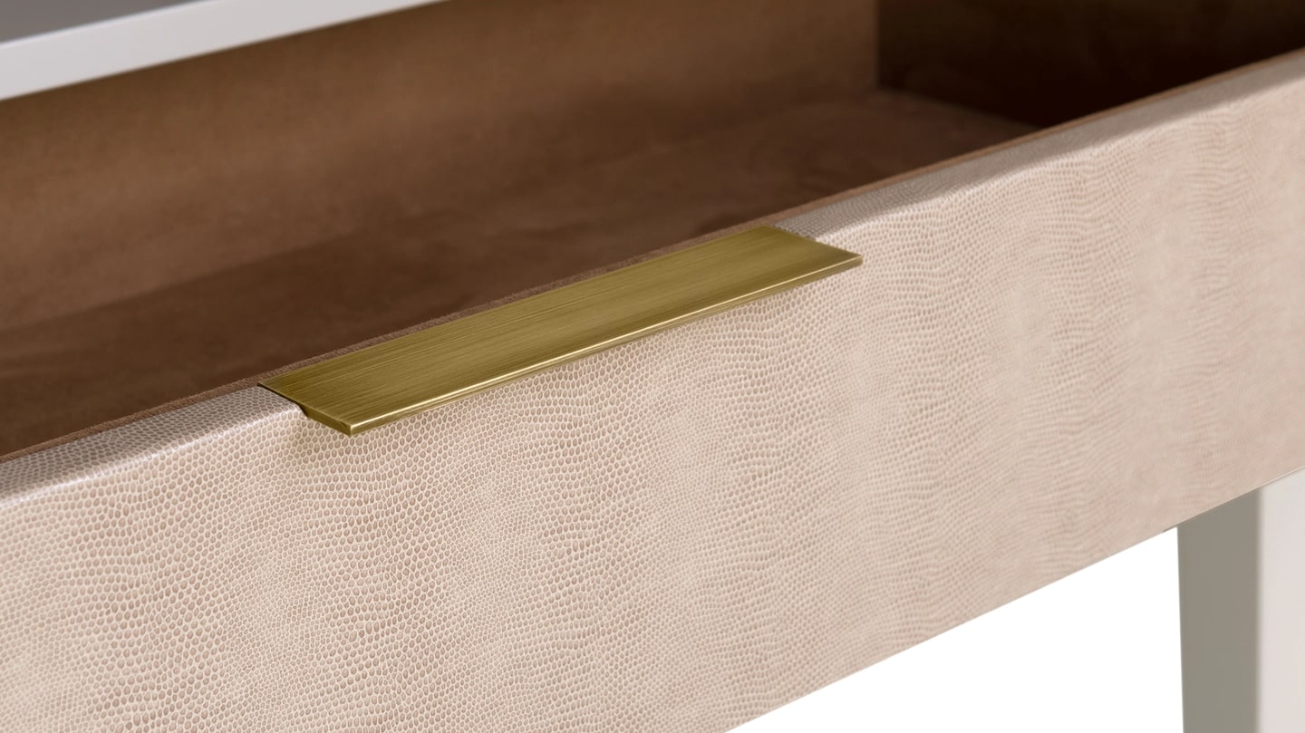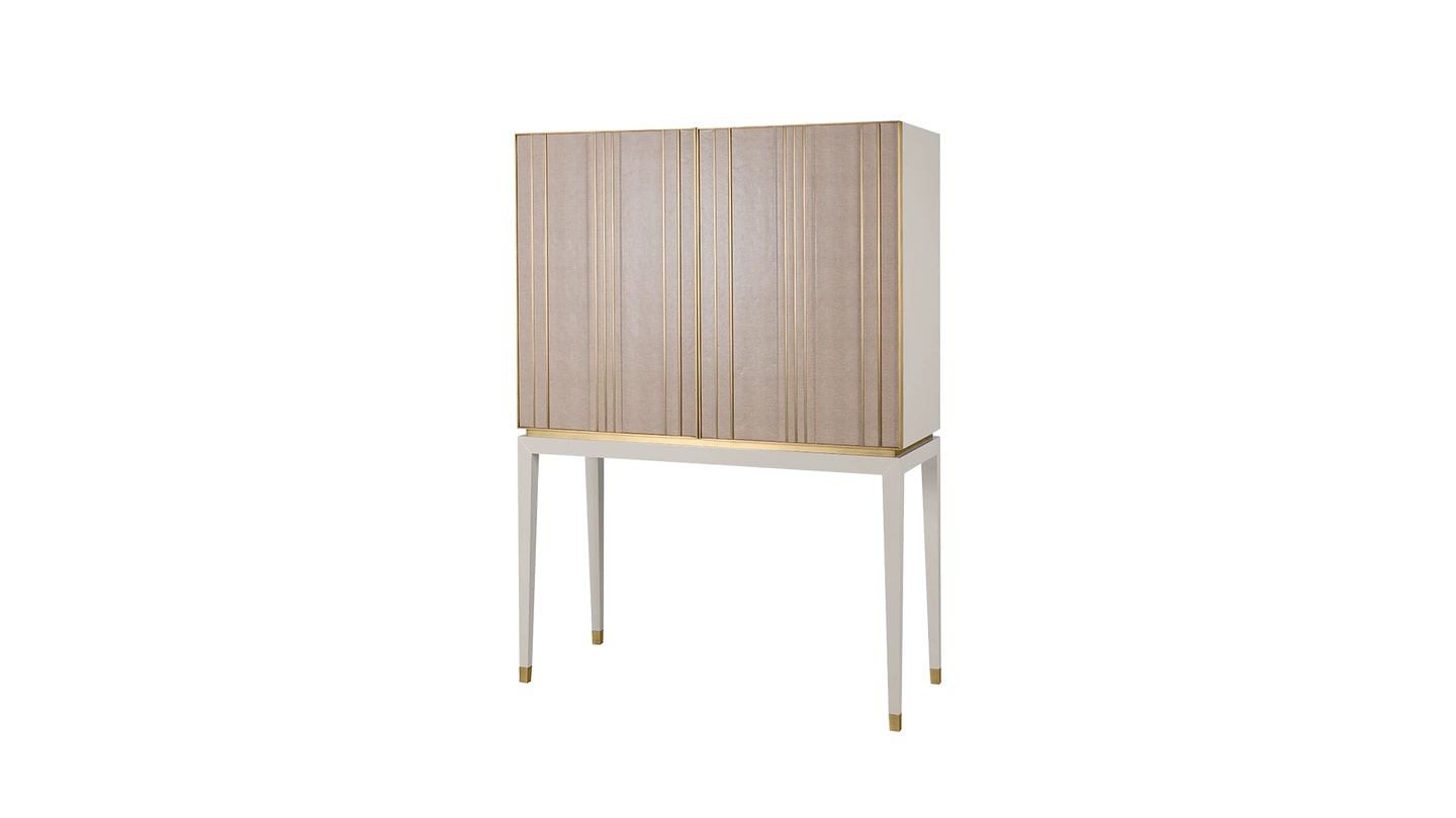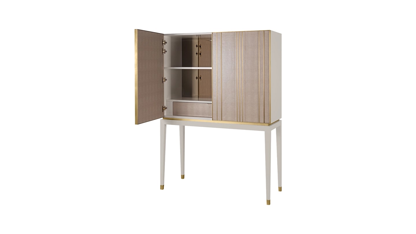 Хранилище, которое привлекает внимание, но в то же время создает ощущение спокойствия в вашем пространстве - ASCOT соответствует обоим критериям. Дверцы, обтянутые кожей, украшены отделкой из матовой латуни, а в оформленном интерьере есть полка, отделанный кожей ящик с замшевой подкладкой и бронзовая зеркальная спинка.
