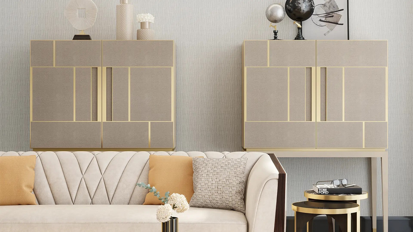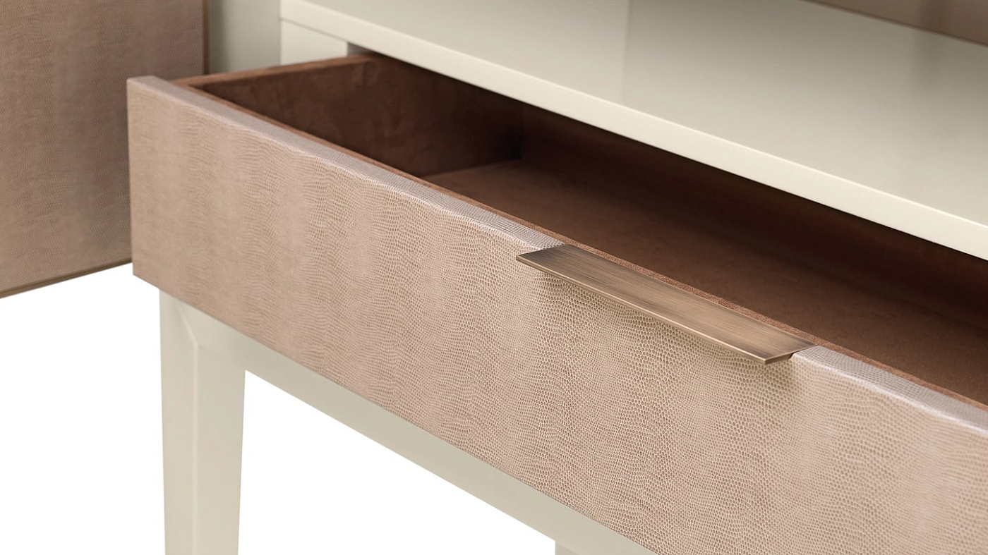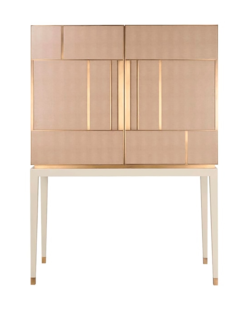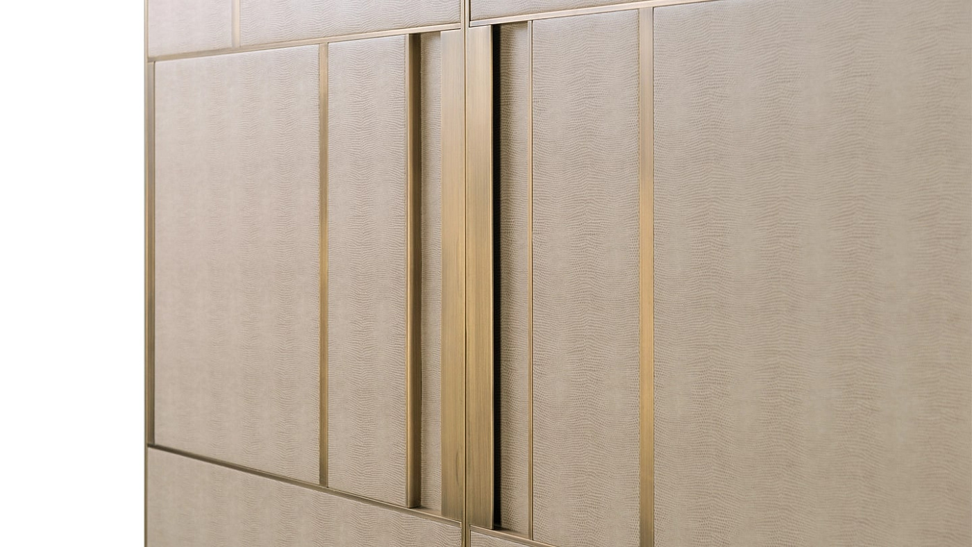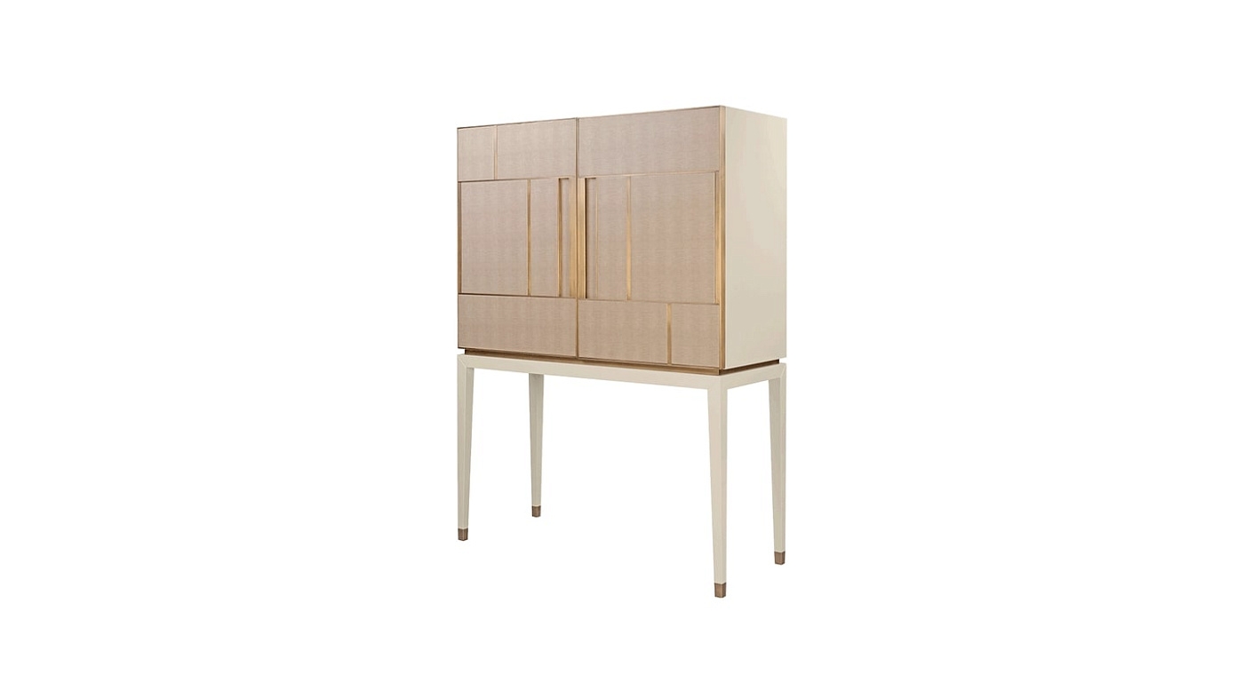 Двойные дверцы высокого шкафа DIDOT из матовой латуни, инкрустированные роскошными панелями из искусственной кожи животных, - шикарный способ придать вашему пространству геометрическую выразительность. Внутри выдвижной ящик, обшитый замшей, обеспечивает компактное хранение, а бронзовая зеркальная спинка добавляет гламура.