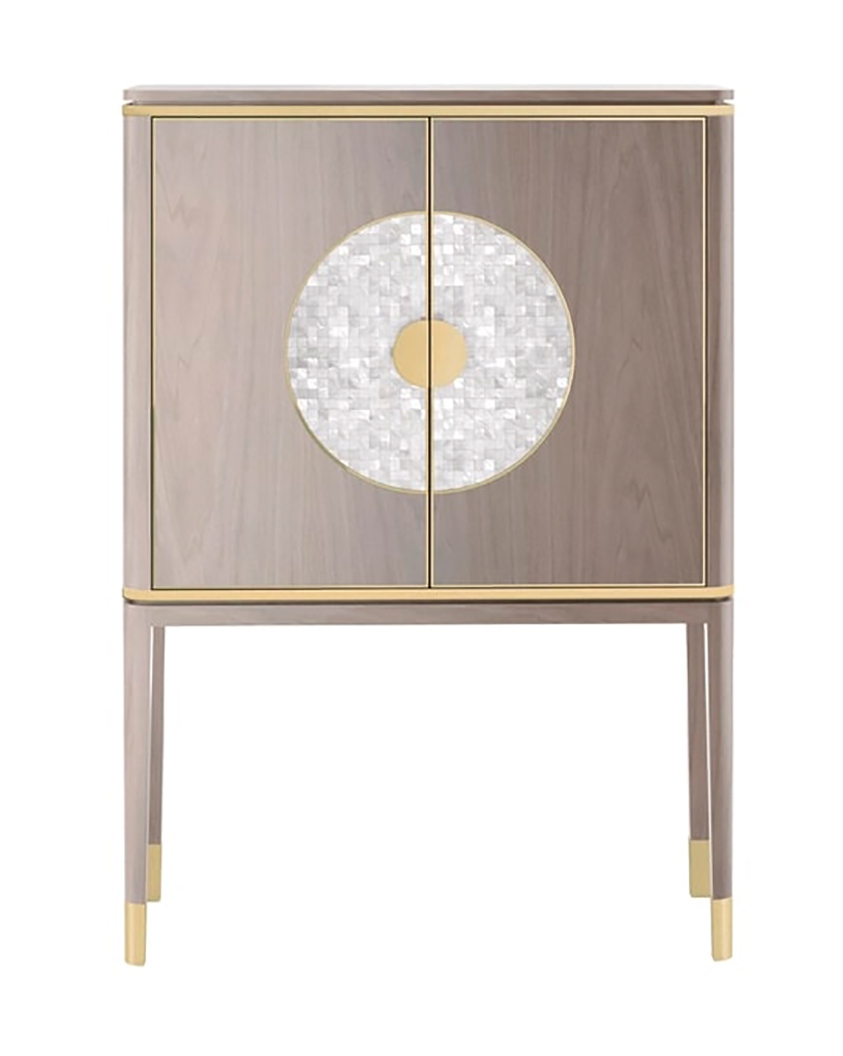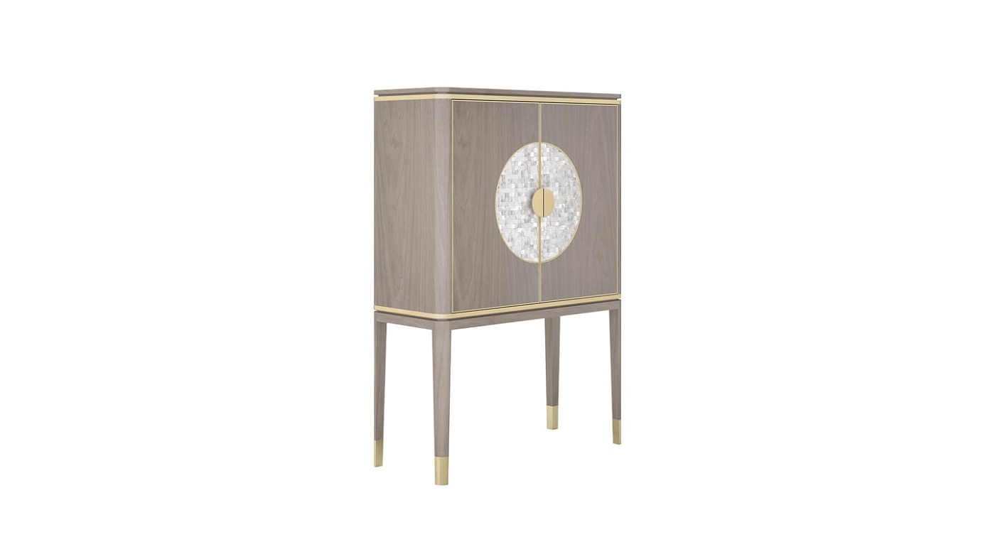 В эффектном высоком шкафу SEVILLE использованы элегантные материалы, подчеркивающие силуэт с укороченной спинкой. Выполненные из глянцевого деревянного шпона, детали из матовой латуни и круглая инкрустация из белого перламутра привлекают внимание.