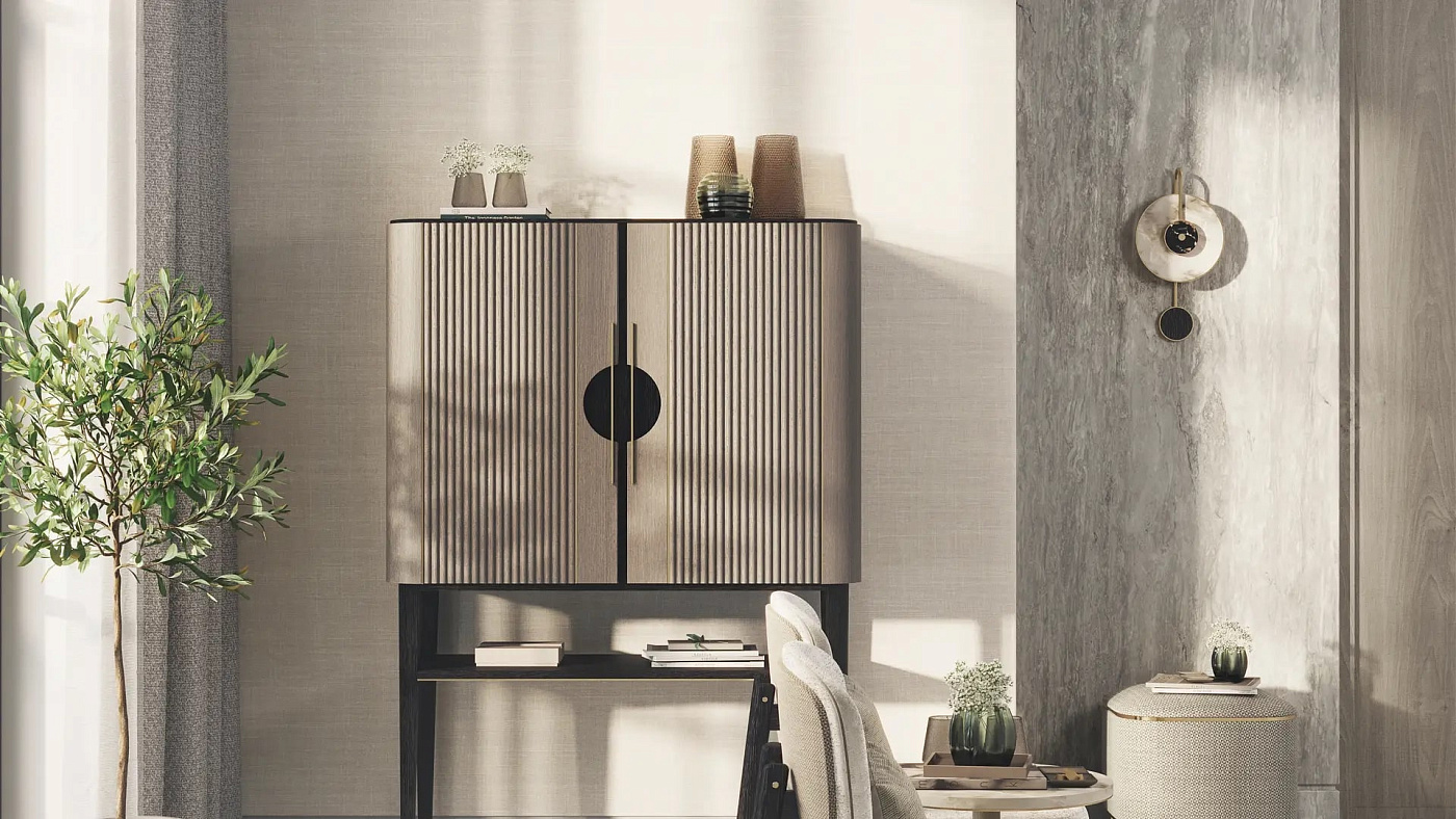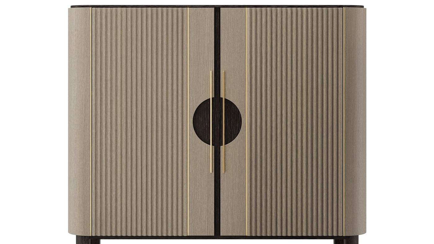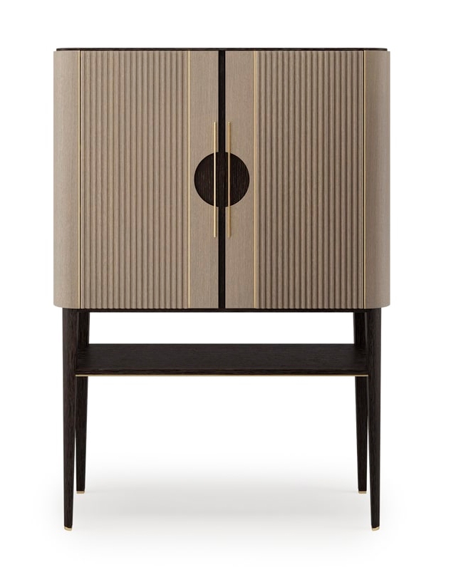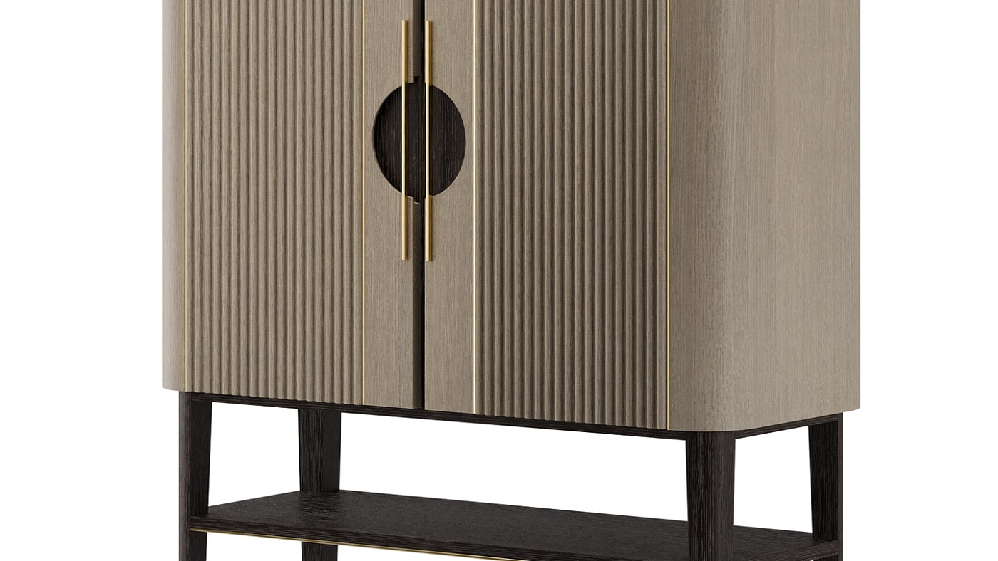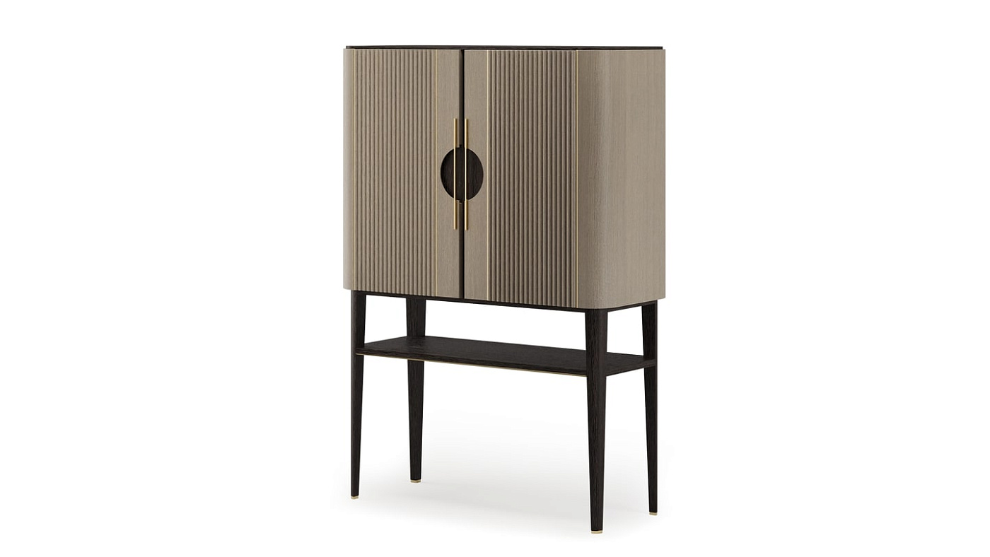 Рифленые деревянные дверцы, подчеркнутые вставками из матовой латуни, и открытая полка отличают высокий шкаф TAIPEI, дизайн которого ориентирован на будущие семейные реликвии.