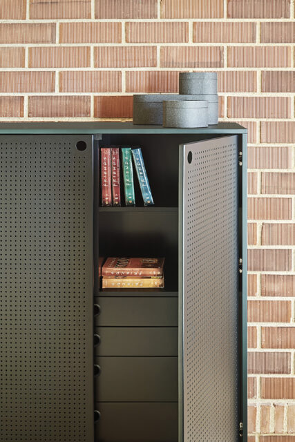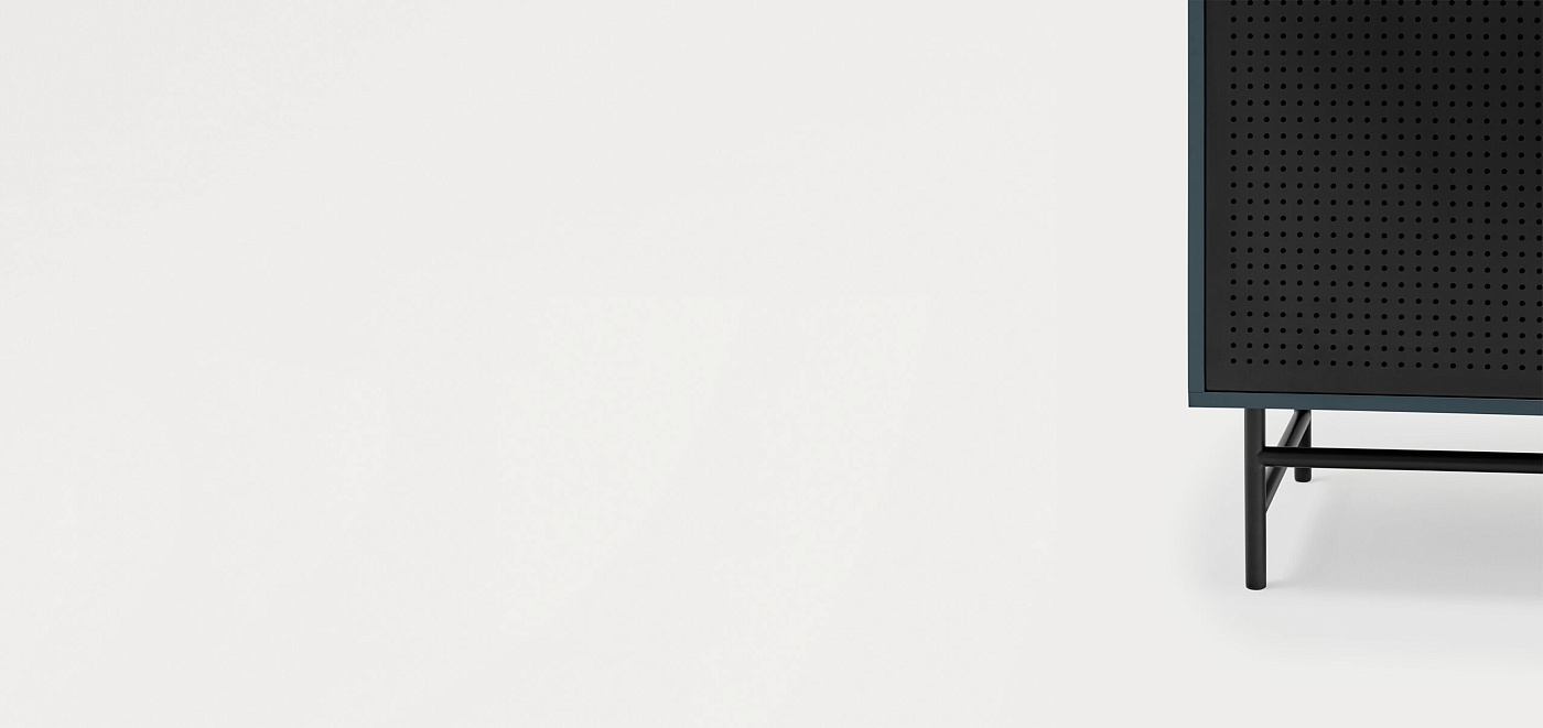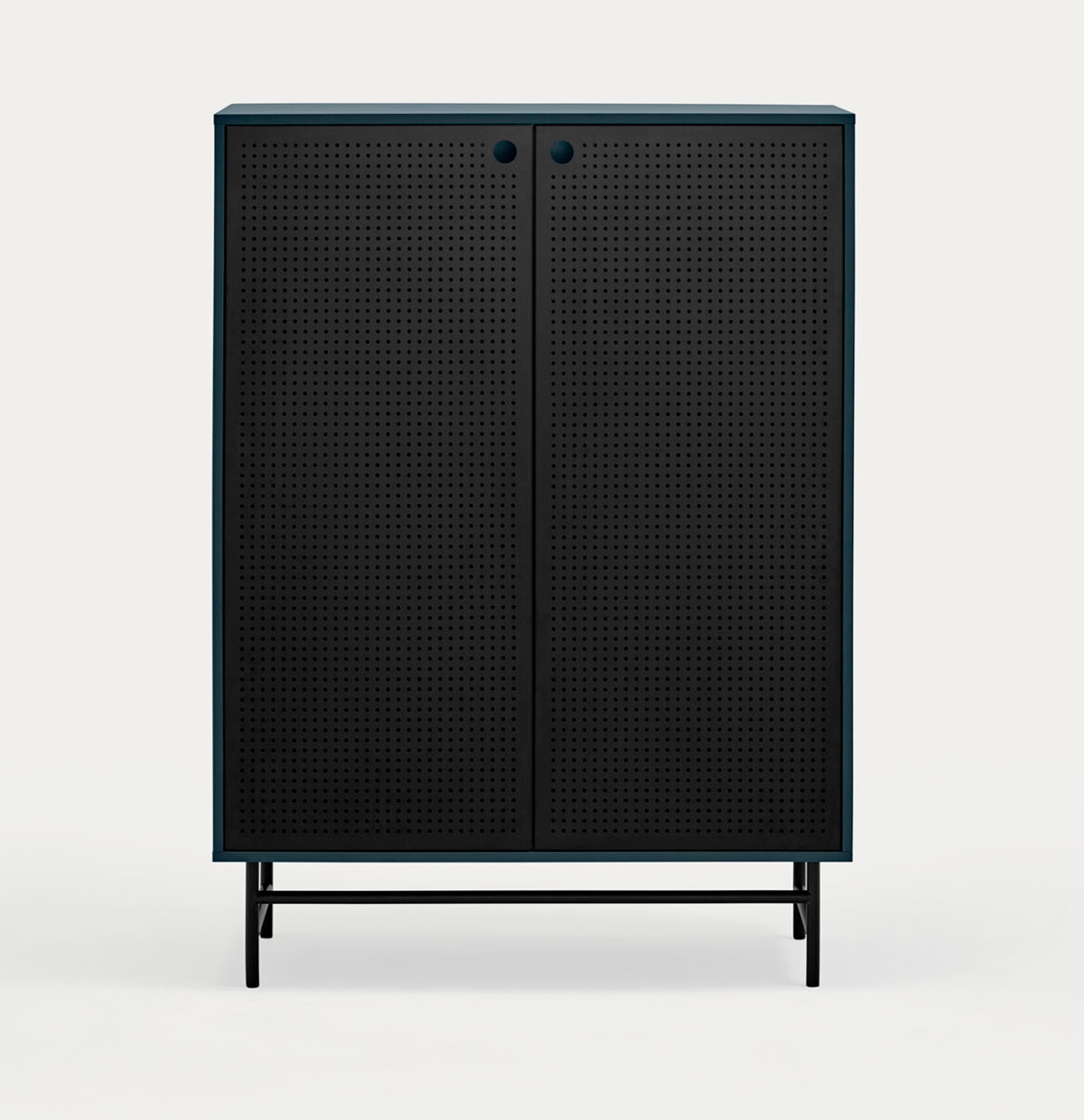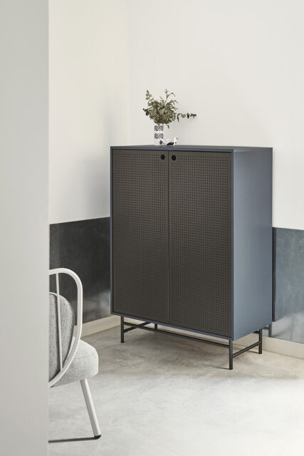 Шкаф Punto, оформленная в индустриальном стиле, сочетает в себе эти эстетические концепции с дизайном и функциональностью. Коллекция отличается перфорированными металлическими дверцами со встроенными круглыми ручками. Корпус выполнен в лакированном МДФ различных цветов.
