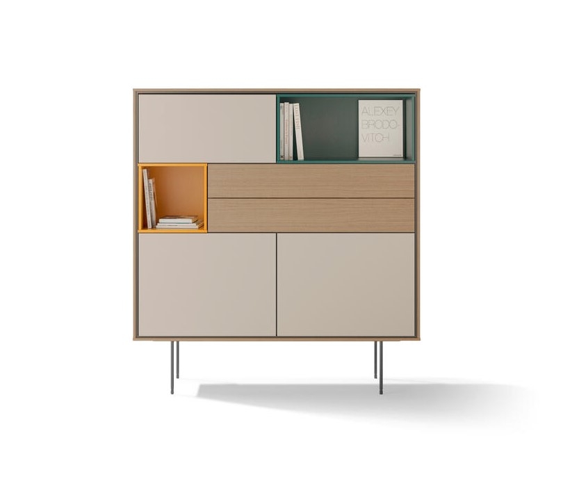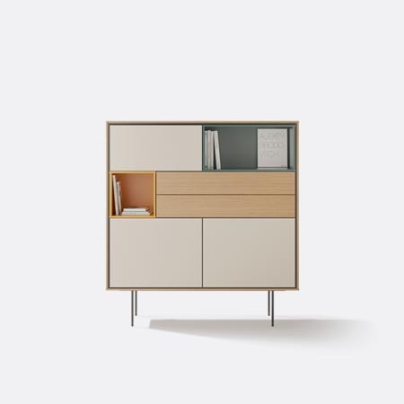 Металлические и деревянные ножки предмета, специально разработанные для коллекции Aura, усиливают ретро-эффект. Особое значение дизайнеры уделили отделке стильного шкафа: яркая глянцевая поверхность фасадов удивительно гармонично дополняет натуральную текстуру букового или орехового дерева, однако, фасады доступны и в других цветах.