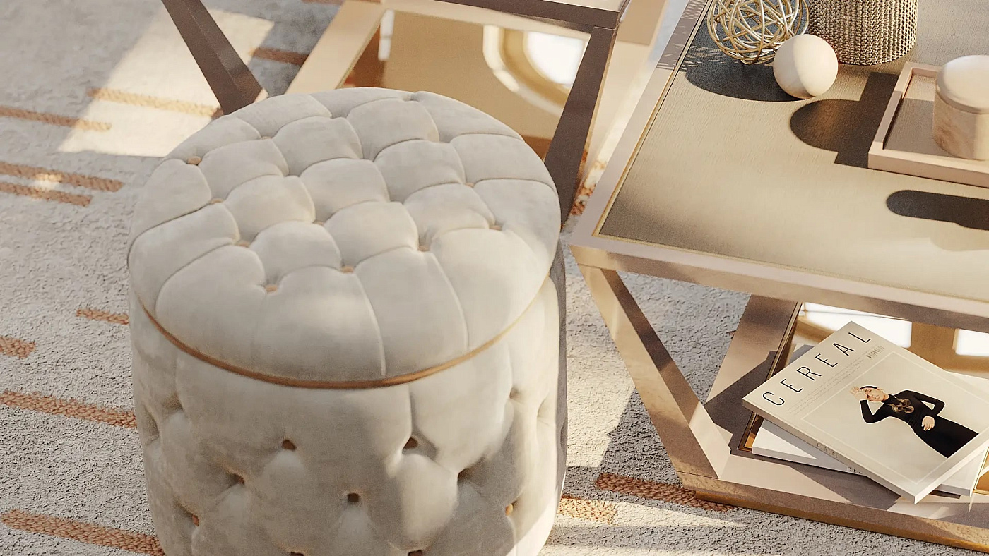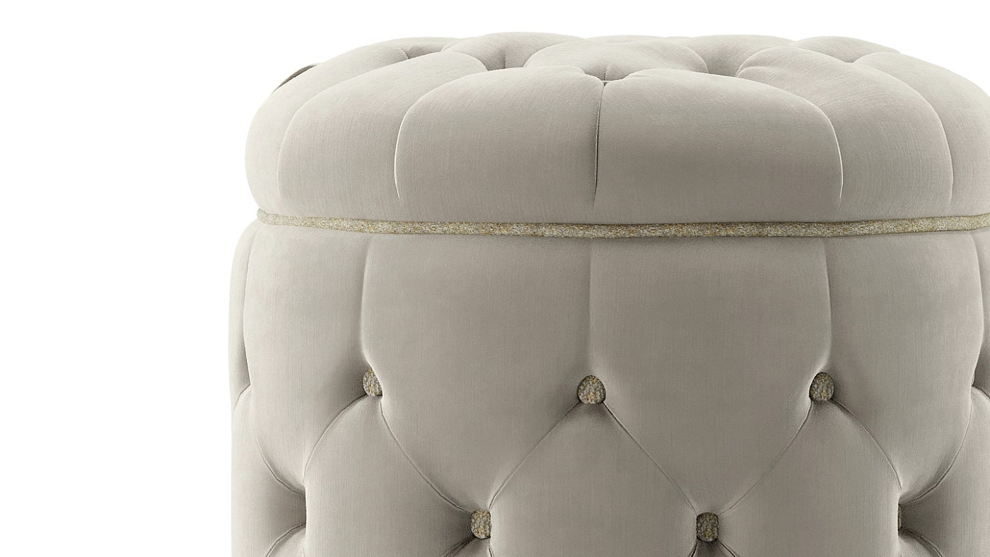 Традиционная отделка пуговицами придает приятную округлость табурету LA SCALA, который может быть обит любой из изысканных тканей из библиотеки материалов FRATO.