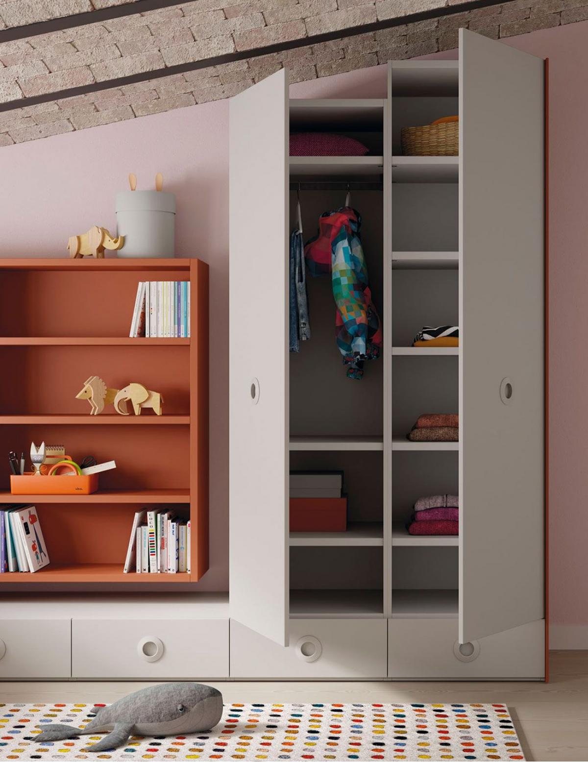 Детская спальня с двухъярусной кроватью Tren с выдвижными ящиками. Стол Levita и шкаф Dressbox.